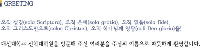 대신대학교 신학대학원은 대한예수교장로회 합동 교단에 속한 선지학교로서 고대 교회 공의회들의 논쟁을 통해 정립된 삼위일체론, 기독론을 비롯하여 종교개혁 이후 1530-1648년까지의 기간 중에 작성된 개신교 신조들을 통하여 형성된 교리들 중에서 특히 개혁교회의 신앙과 신학을 지키고 계승하고자 합니다. |