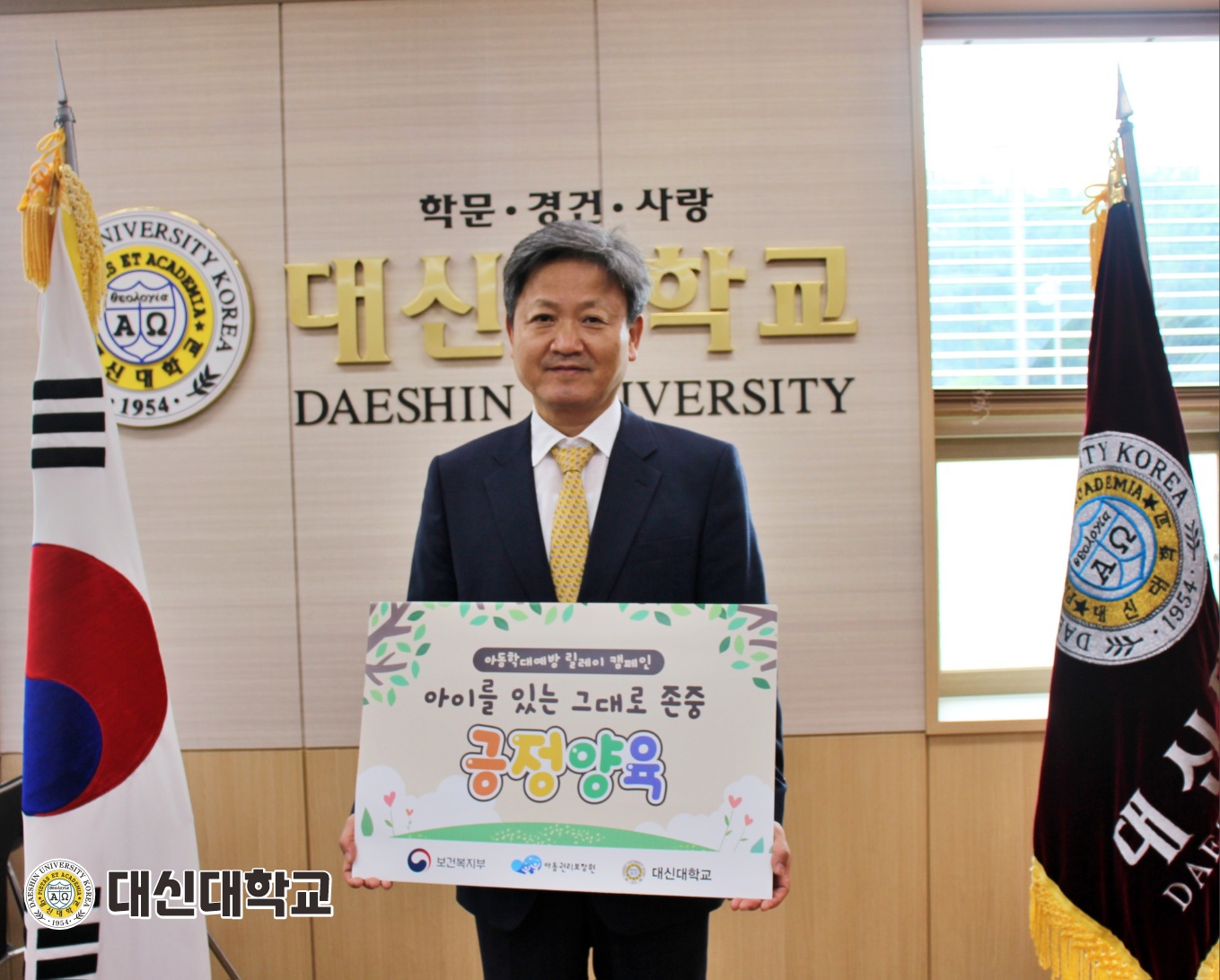 서울신학대학교 황덕형 총장님의 지목으로 보건복지부와 아동권리보장원에서 공동 주최한 “아동학대예방 릴레이 캠페인”에 참여할 수 있게 되어 기쁘게 생각합니다. 아동학대는 단순히 개인의 문제를 넘어서서 사회 전체의 건강과 미래에 영향을 미치기 때문에 사회 전체가 경각심을 가지고 함께 해결해야 할 문제입니다. 저와 대신대학교 전구성원들은 모든 아동들이 건강한 사회에서 살아갈수 있도록 아동학대에 대한 심각성을 일깨우고 아동학대예방 및 긍정양육 확산을 위해 최선을 다해 노력하겠습니다. 다음 〈아동학대예방 릴레이 캠페인〉 주자로 영남신학대학교 유재경총장님과 칼빈대학교 황건영총장님을 추천합니다. #보건복지부 #아동권리보장원 #아동학대예방릴레이 캠페인 #대신대학교 #영남신학대학교 #칼빈대학교