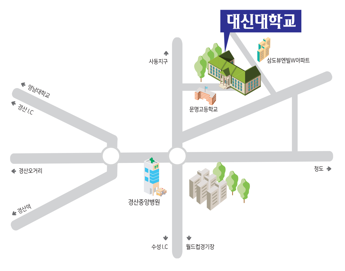 - 대구시내버스 : 939, 809, 100-1번을 이용하여 백천동 대신대학교에서 하차.