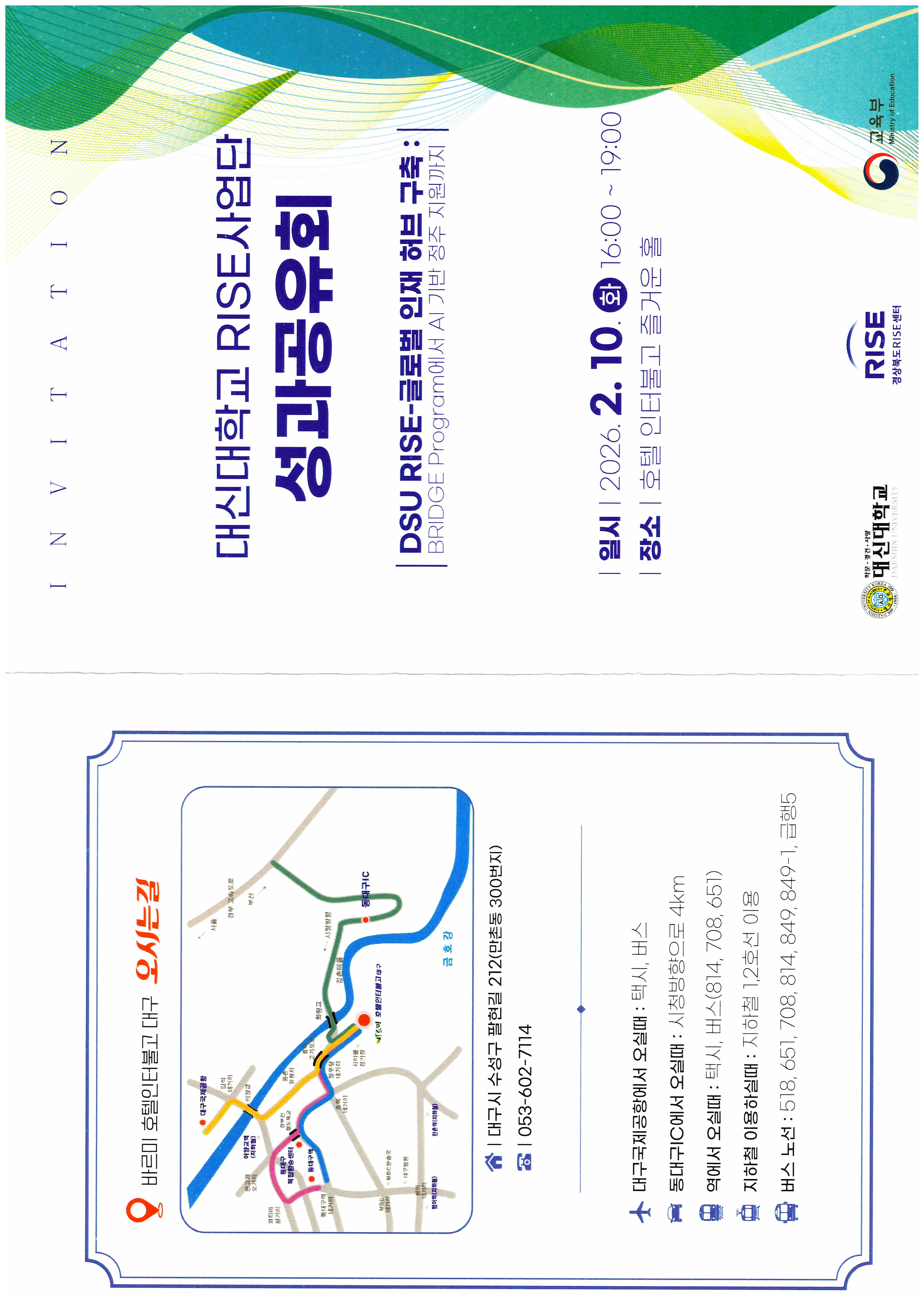 대신대학교 2026년 『DSU RISE 글로벌 인재허브 구축』 성과발표회 1. 일 시 : 2026. 02. 10.(화) 16:00 ~ 2. 장 소 : 호텔 인터불고 즐거운 홀 (대구 수성구 팔현길 212) 3. 주요내용 1) RISE사업단 1차년도 추진 성과 발표 2) 학과 및 부서별 성과 및 우수사례 발표