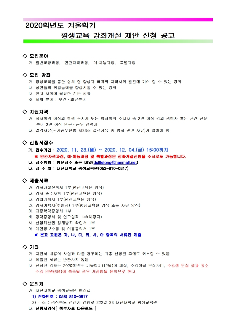 | 2020학년도 겨울학기(12월) 평생교육 강좌개설 제안 신청 공고 | |||||||||