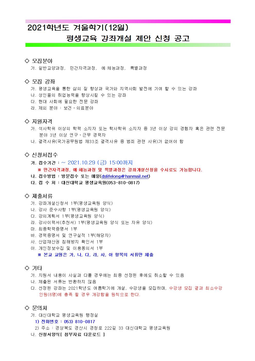 | 2021학년도 겨울학기(12월) 평생교육 강좌개설 제안 신청 공고 | |||||||||