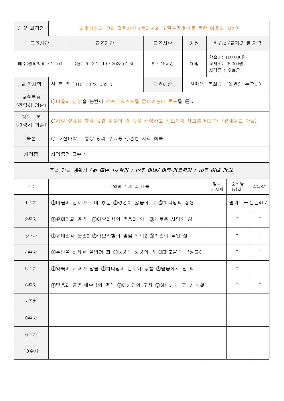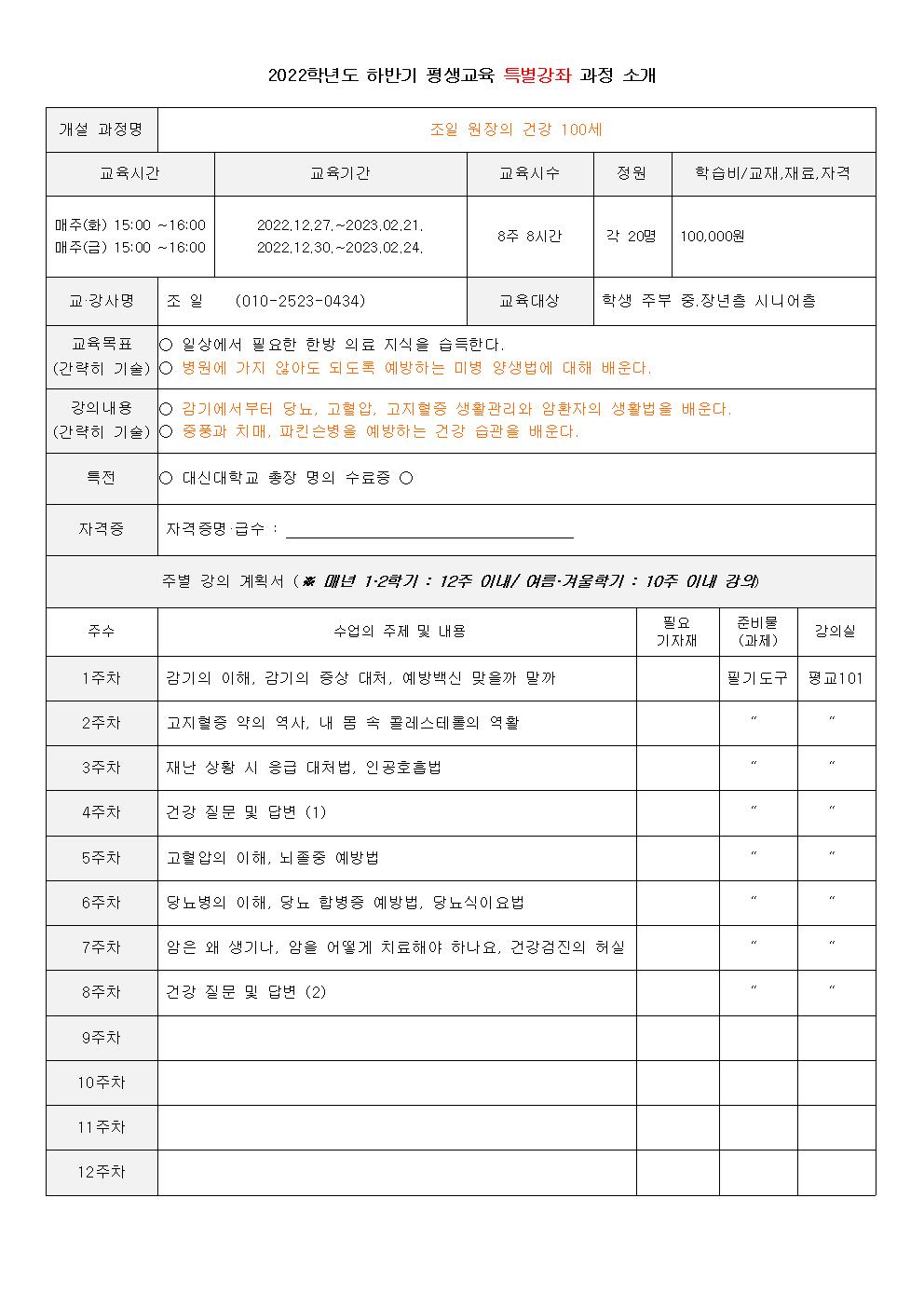 2022학년도 하반기 특별강좌 수강생 모집안내