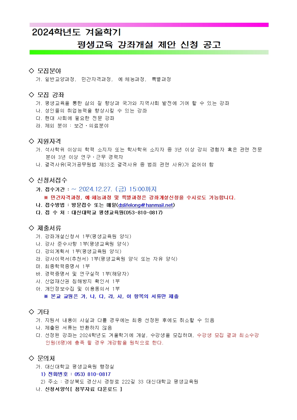| 2024학년도 겨울학기 평생교육 강좌개설 제안 신청 공고 | |||||||||