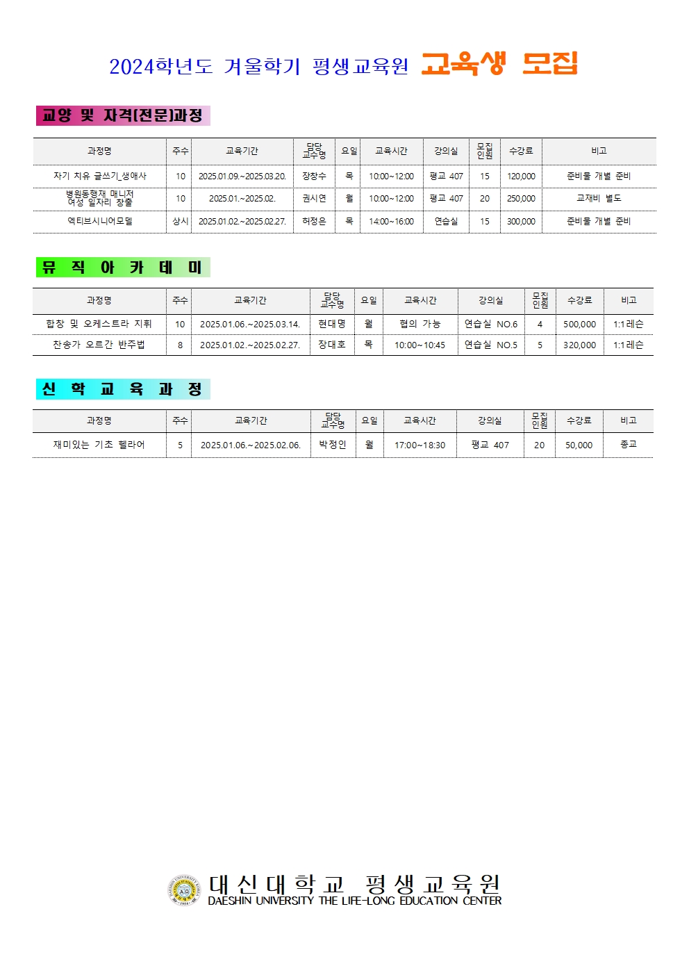 2024학년도 겨울학기 수강생 모집안내