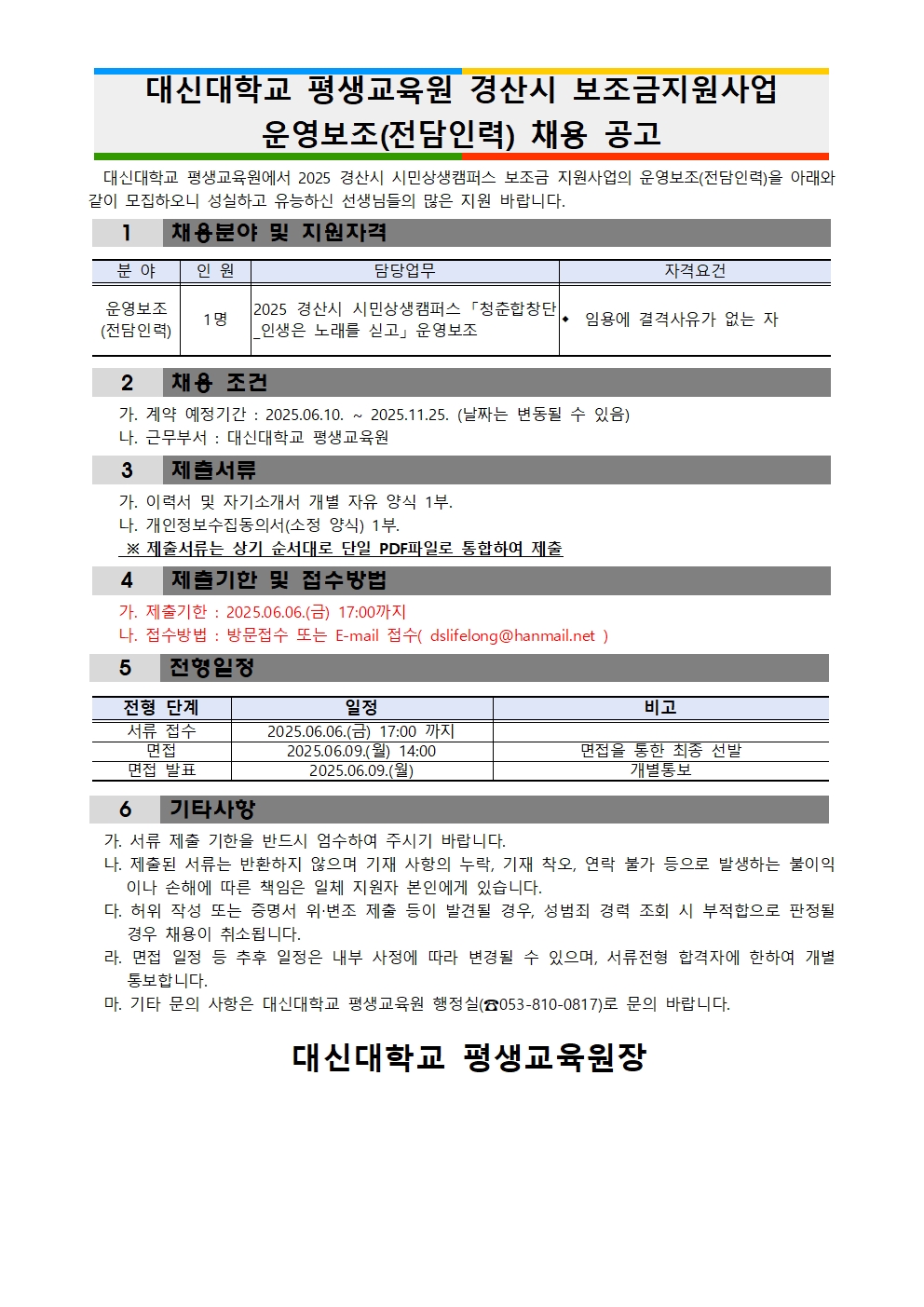 ▶모집부문 : 2025 경산시 시민상생캠퍼스 보조금지원사업 운영보조(전담인력) ▶근무형태 : 계약직 ▶근 무 처 : 대신대학교 평생교육원 ▶모집인원 : 1명 ▶모집기간 : 2025.06.06(금) 17:00 까지 ▶문 의 : 대신대학교 평생교육원 행정실 053-810-0817 |