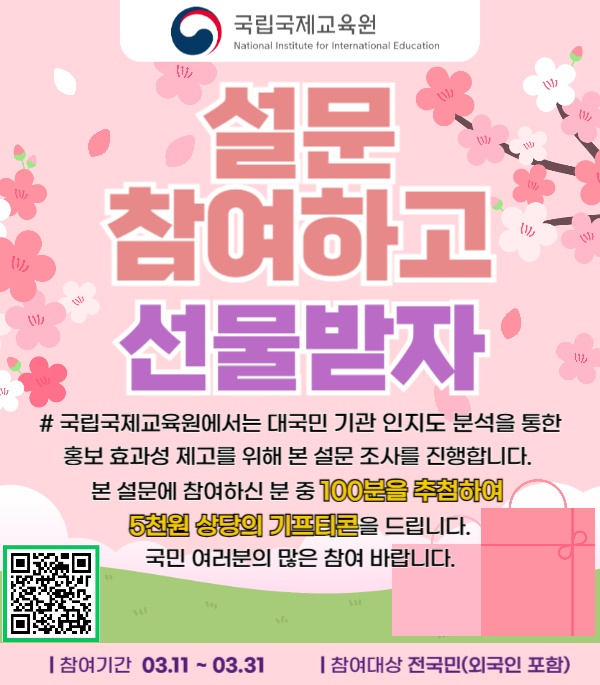 ㅇ조사명: [국립국제교육원] 기관 인지도 설문조사 이벤트 ㅇ조사참여: 국민신문고 국민생각함 접속 및 설문조사 실시 ※ (URL) https://www.epeople.go.kr/cmmn/idea/redirect.do?ideaRegNo=1AE-2402-0000531(포스터 좌측 하단 QR코드 포함) (SNS) 국립국제교육원 인스타그램, 유튜브 등에서도 참여 가능 ㅇ조사기간: '24.3.11.(월) ~ 3.31.(일) ㅇ조사대상: 전 국민(내국인, 외국인(유학생 포함)) ㅇ조사내용: 기관인지도 및 추진사업 인지도 관련 총 10개 문항