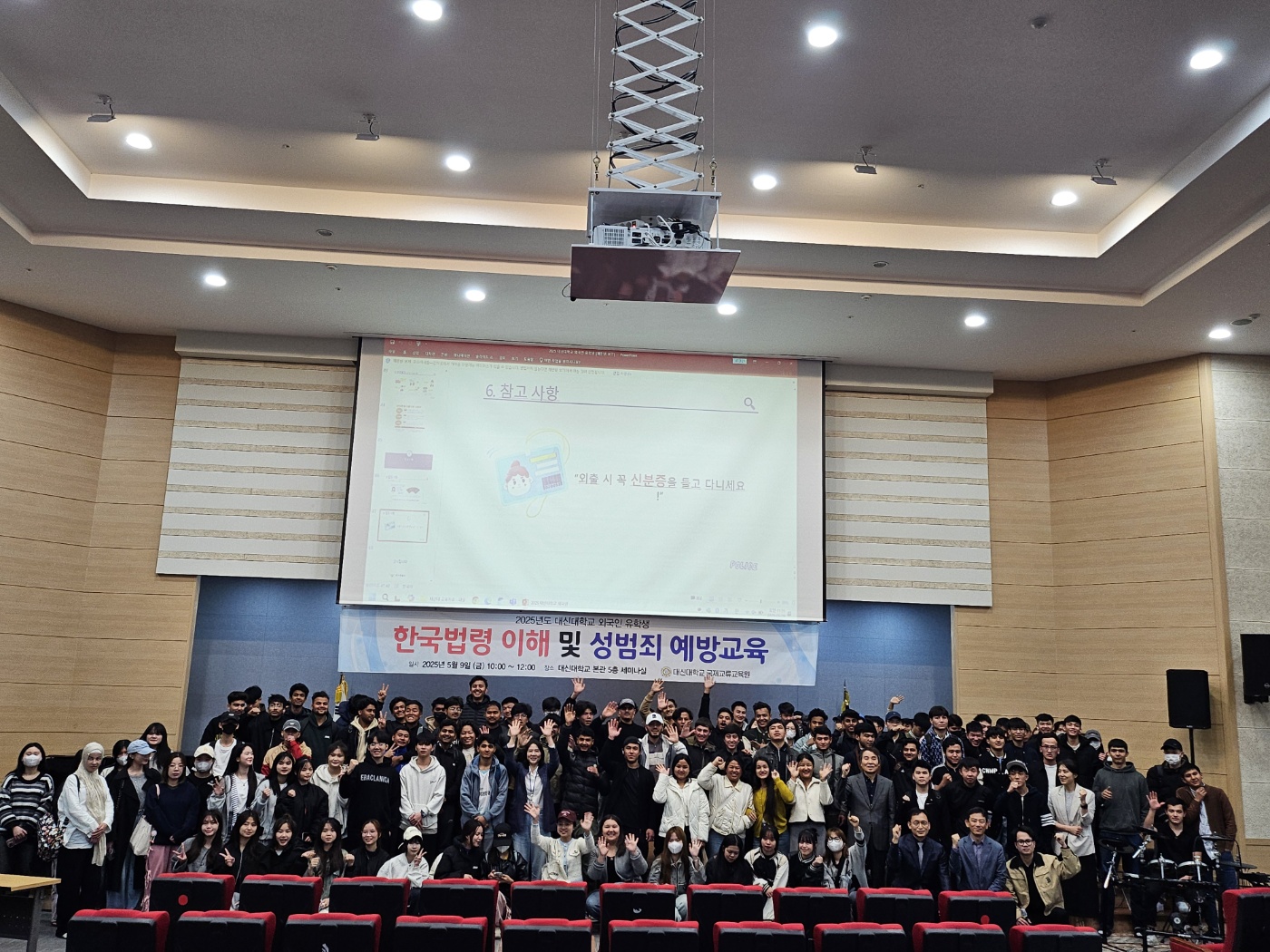 외국인 유학생 한국법령이해 및 성범죄 예방교육 1. 일시 : 2025년 5월 9일 (금) 10:00~12:00 2, 장소 : 대신대학교 본관 5층 세미나실 3, 대상 : 외국인 유학생 재학생(어학연수과정, 학위과정)