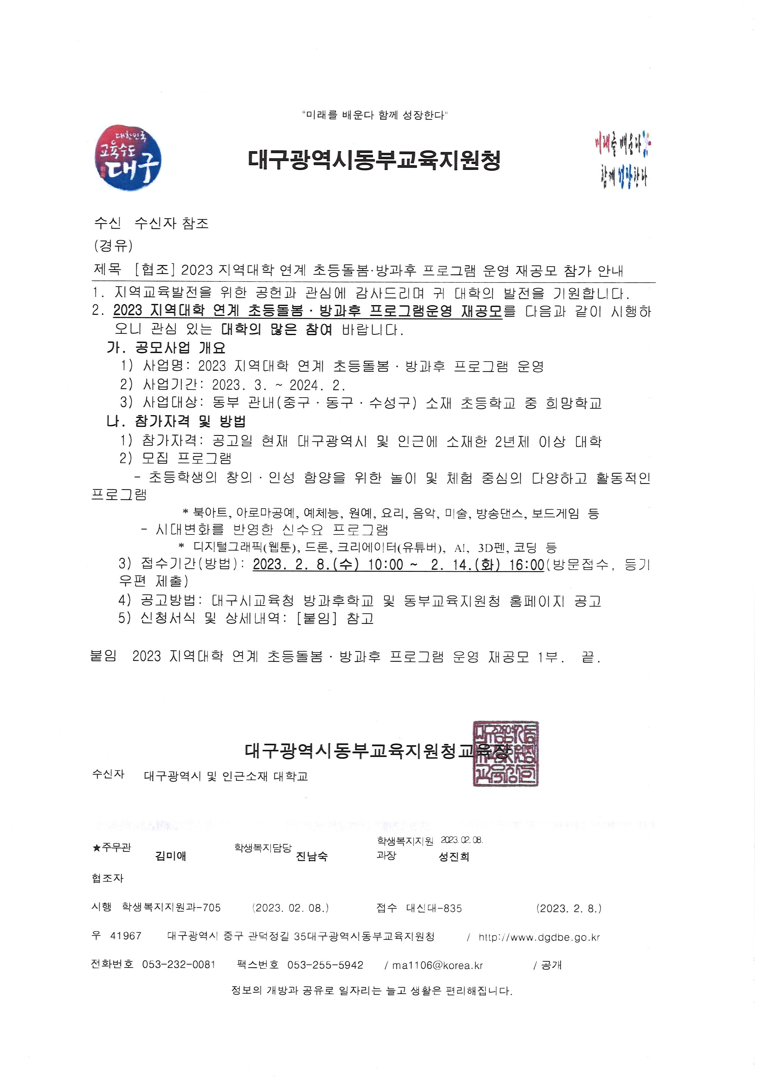2023 지역대학 연계 초등돌봄.방과후 프로그램 운영 재공모 참가 안내