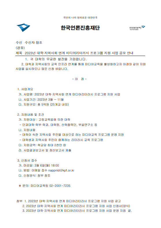 1 2023년 대학·지역사회 연계 미디어리터러시 프로그램 지원 사업 공고.hwp