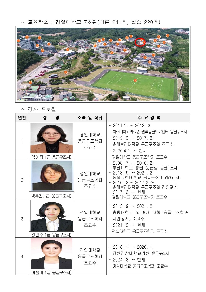 1. 기 간 : 2024.07.08(월) ~ 07.11(목) 4일간 2. 장 소 : 경일대학교 7호관 (이론 214호, 실습 220호) 3. 인 원 : 260명 (기초 120명, 심화 140명) 4. 교육강사 : 김아정 외 3명 (응급 구조학과 교수) 5. 내 용 : 심폐소생술 기초 · 심화과정 6. 주 관 : 경산시 & 경일대학교 |