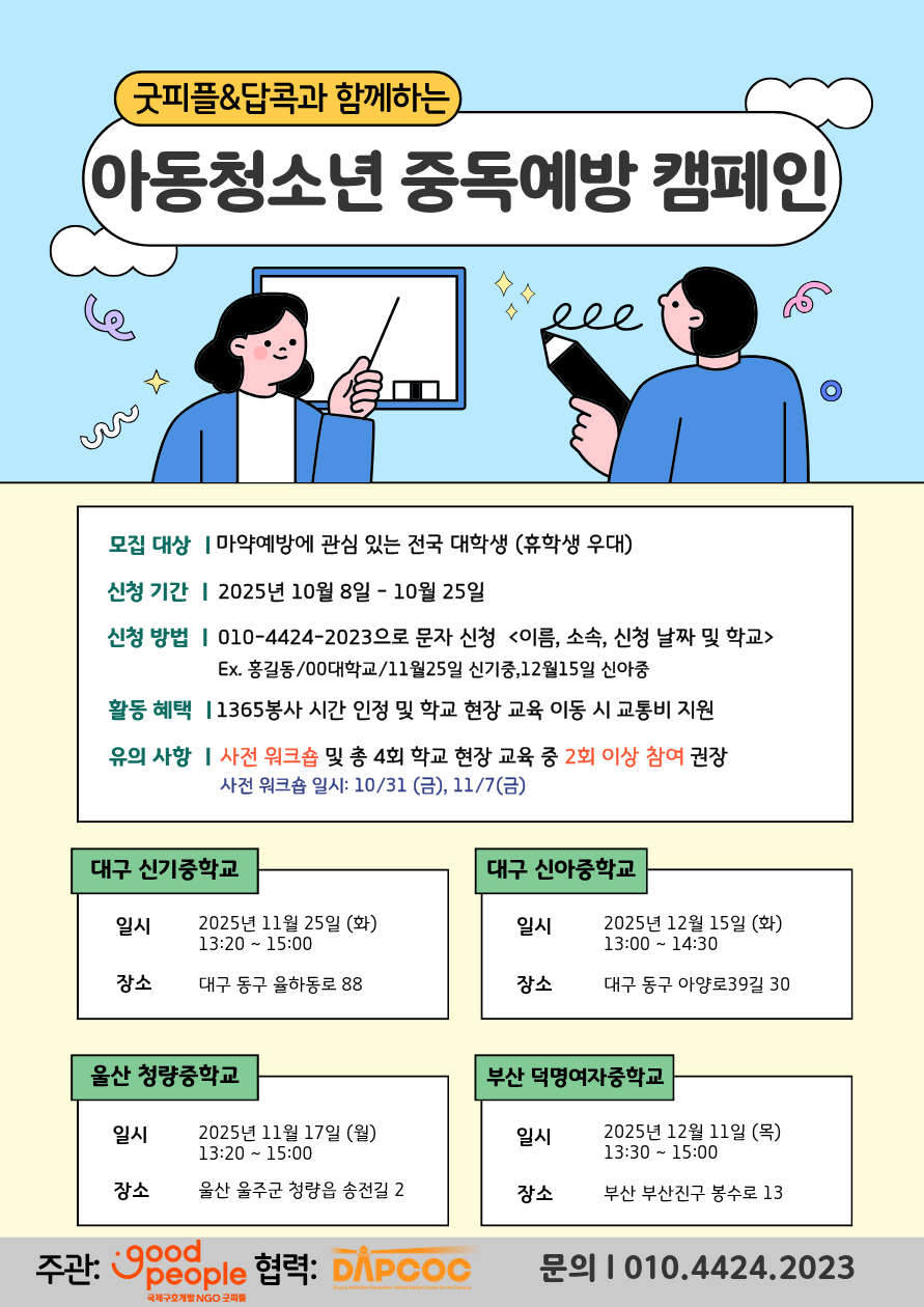 | [대학을위한마약중독예방재활센터] 아동·청소년 중독예방 캠페인 봉사자 모집 | |||||||||