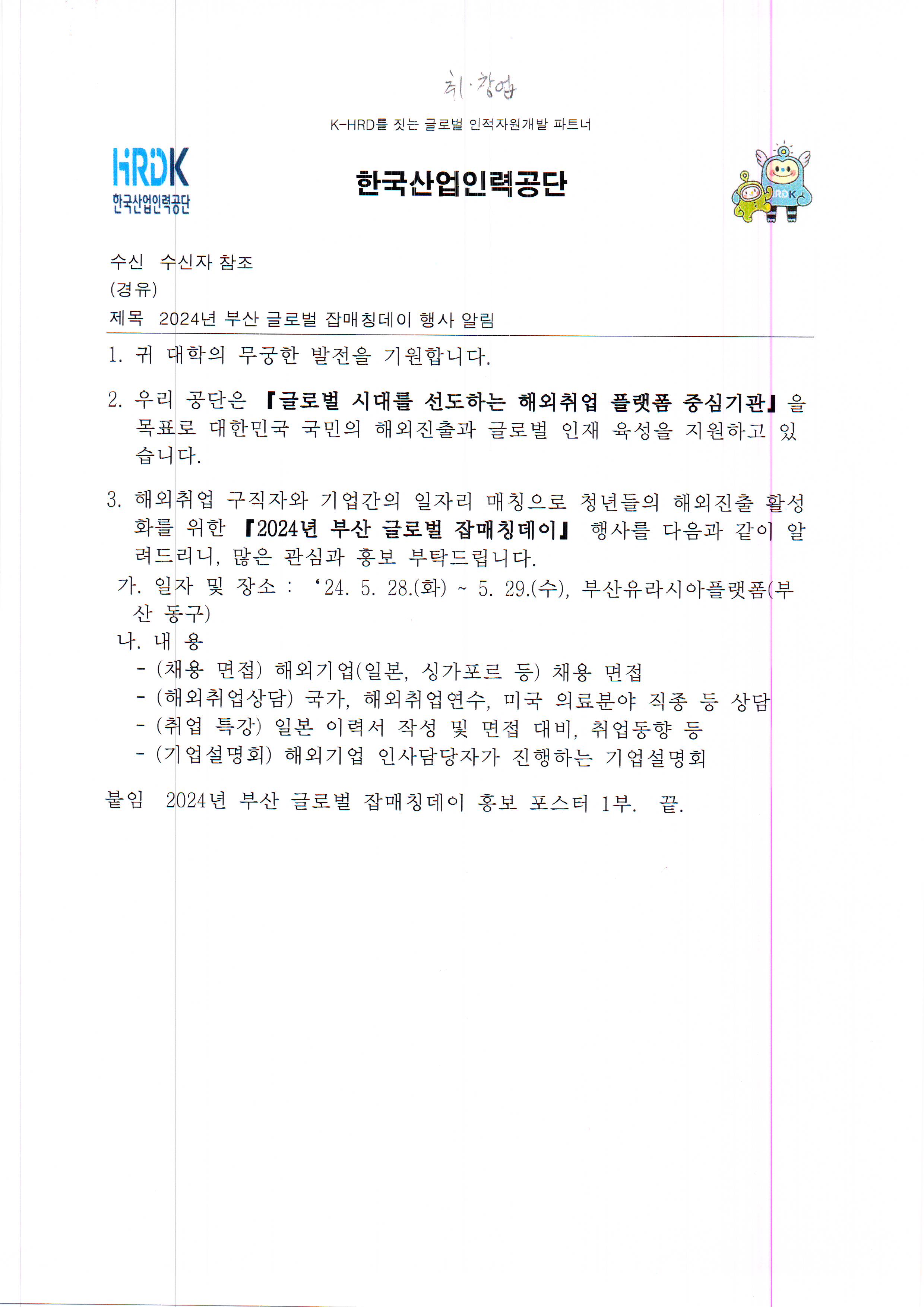 | 한국 산업 인력공단 2024년 부산 글로벌 잡매칭 데이 행사 | |||||||||