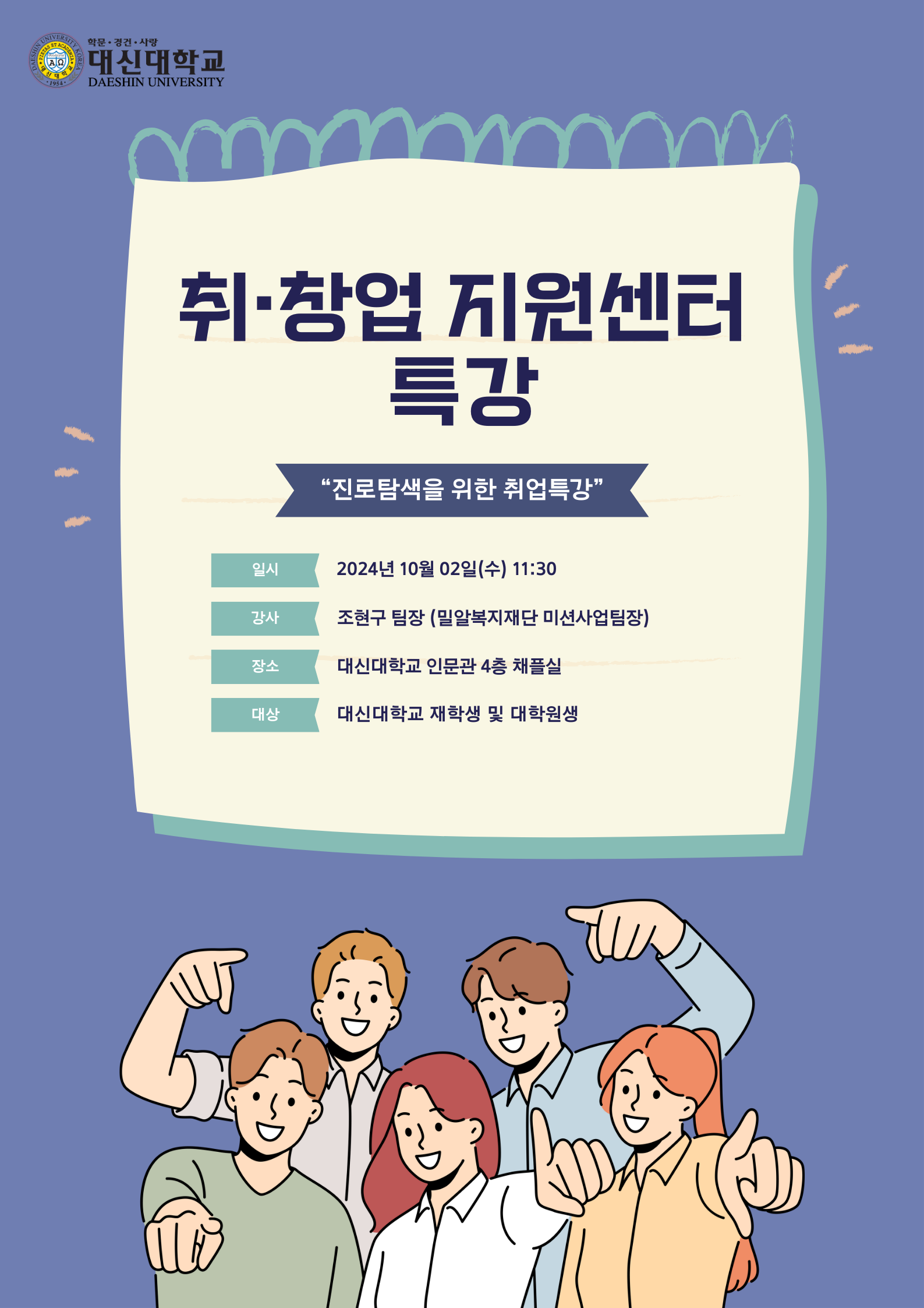1. 주제 : '진로탐색을 위한 취업특강' 2. 일시 : 2024.10.02. (수) 11:30-12:15 3. 장소 : 인문관 4층 채플실 4. 대상 : 대신대학교 재학생 및 대학원생 5. 강사명 : 조현구 팀장(밀알복재재단 미션사업팀장) |