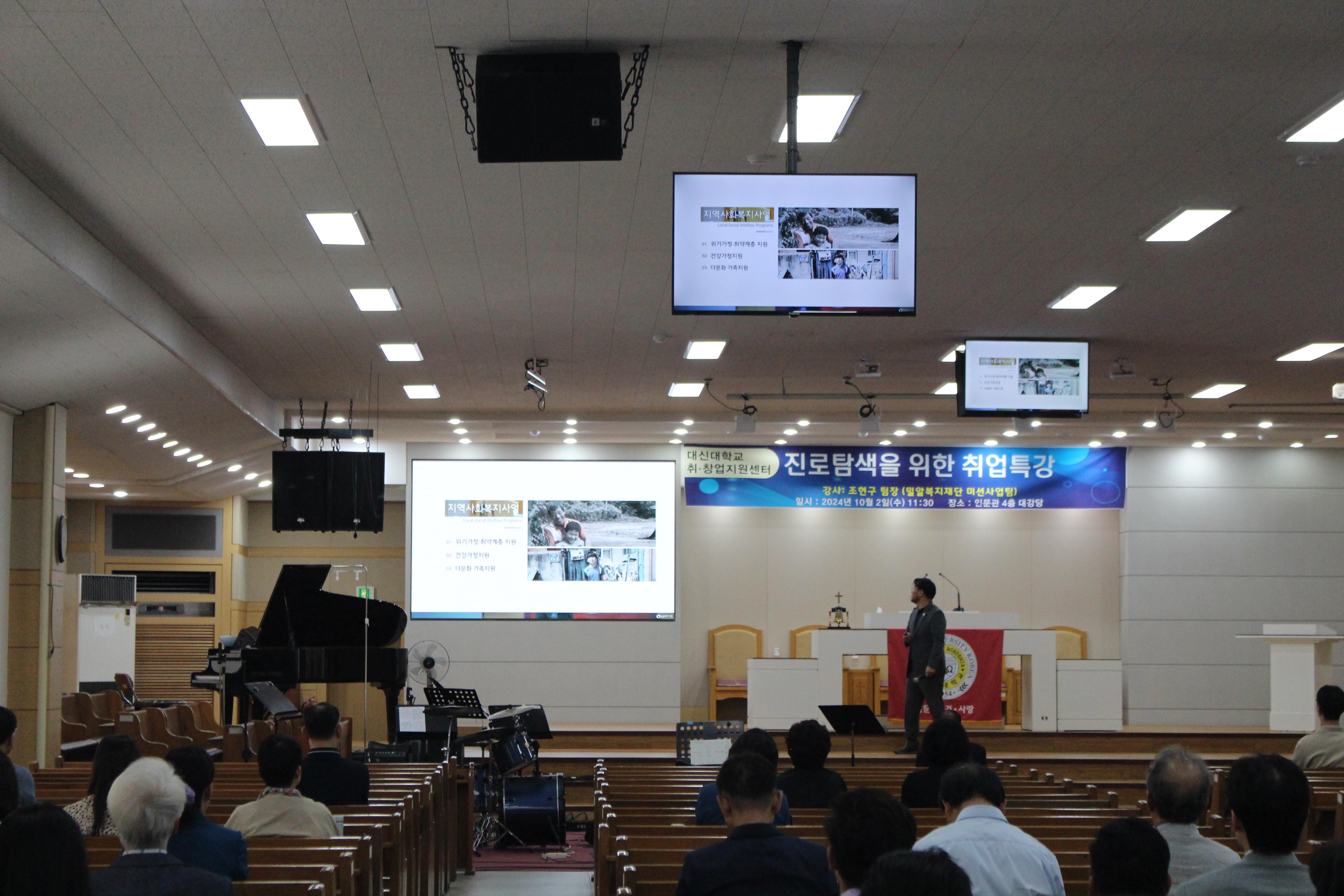 1. 주제 : ‘진로탐색을 위한 취업특강' 2. 일시 : 2024.10.02. (수) 11:30-12:15 3. 장소 : 대신대학교 인문관 4층 채플실 4. 강사명 : 조현구 팀장(밀알복지재단 미션사업팀)