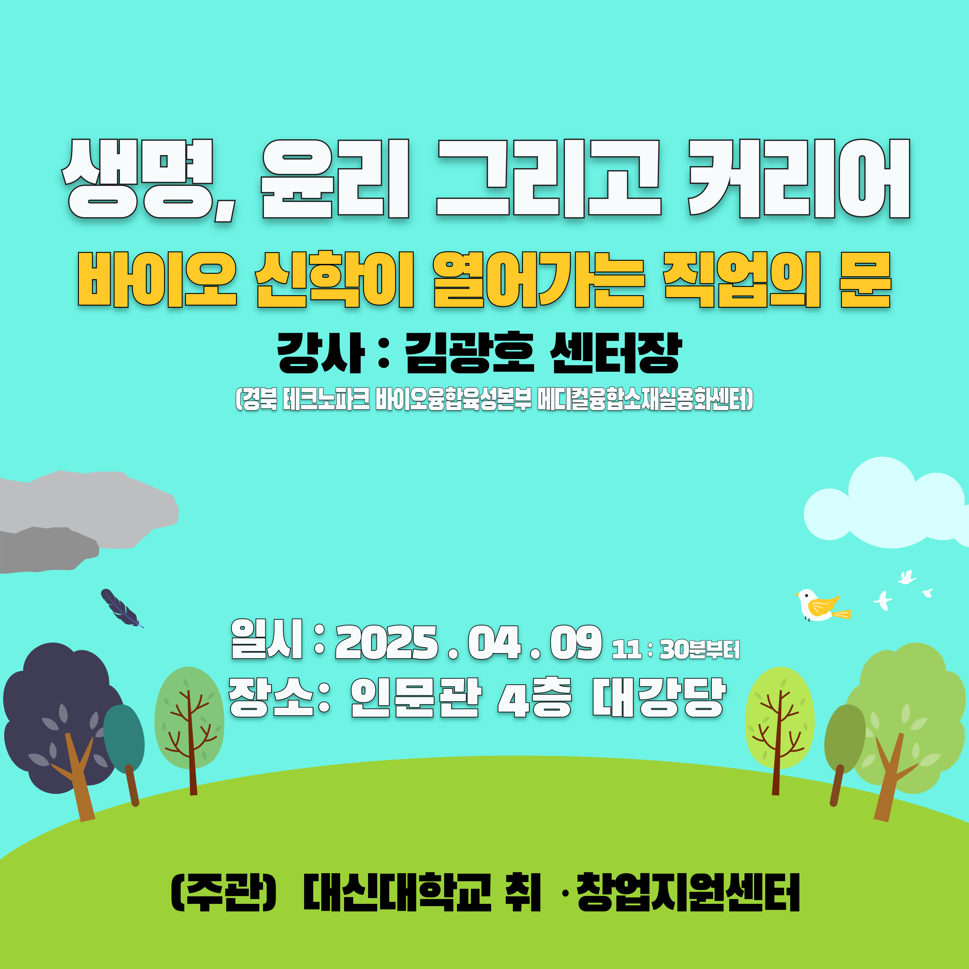 1. 주제 : '생명, 윤리 그리고 커리어: 바이오 신학이 열어가는 직업의 문' 특강' 2. 일시 : 2025.04.09. (수) 11:30 부터 3. 장소 : 인문관 4층 채플실 4. 대상 : 신대학교 재학생 및 외국인 유학생, 대학원생 5. 강사명 : 김광호 센터장 (경북테크노파크 바이오융합육성본부 메디컬융합소재실용화센터 센터장)