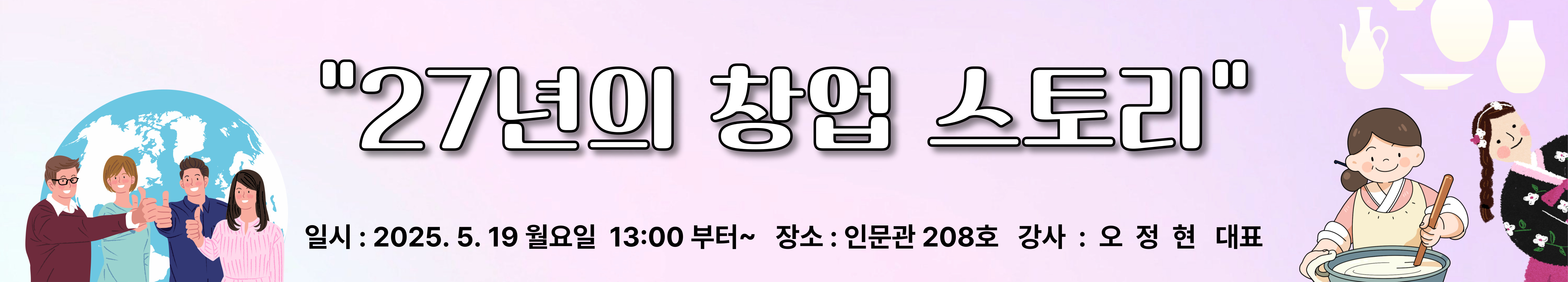 1. 주제 : '27년의 창업 스토리 특강 및 간담회' 2. 일시 : 2025.05.19. (월) 13:00 부터 ~ 3. 장소 : 인문관 2층 208호 강의실 4. 대상 : 대신대학교 재학생 및 외국인 유학생 5. 강사명 : 오 정 현 (대표)