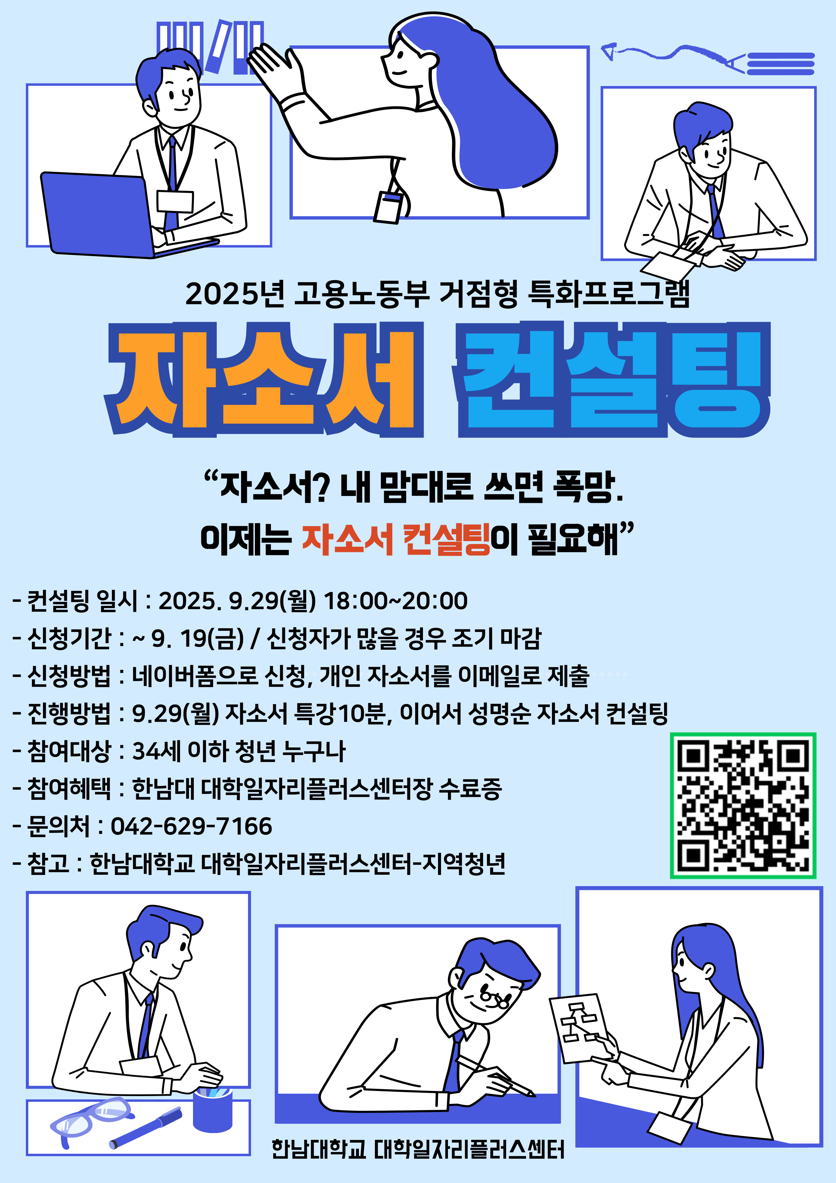 - 일시 : 9. 29(월) 18:00 * 신청자가 많을 경우 10. 1. 18:00에 2차 진행 예정 - 참여대상 : 자소서 컨설팅 신청자, 자소서 제출자 * 네이버폼으로 자소서를 신청하고, 이메일로 자소서를 선착순 전송 - 방법 : 실시간 온라인 교육(참여방법은 별도 안내) - 신청 : https://naver.me/xhlK8umd - 자소서 전송 : 이메일 (jrkwon7@hnu.kr) - 자소서 양식 : 입사지원서 실제 양식 가능, 사람인, 고용24, 잡코리아 등 양식 제출 가능. - 주요내용 : 이메일로 보내준 자소서는 사전 강사에게 전달, 9.29.18시에 자소서 제출한 분의 공통적인 수정사항 특강, 이어서 가나다순으로 개별 10분 컨설팅 진행 - 문의 : 한남대 취업지원팀 042-629-7166 - 강사 : 취업전문강사 |