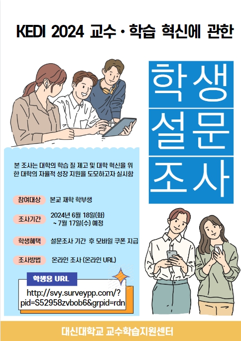 대신대학교 교수학습지원센터는 수업방법의 개선과 학생 성장 역량 강화에 도움을 드리고자 합니다. 수업방법을 개선하기 위한 워크숍, 수업컨설팅 및 교수연구회 프로그램이 있으며 학생 성장 역량 강화를 위한 워크숍, 학습공동체, 공모전 프로그램을 운영하고 있습니다. 가르침과 배움의 활동을 통한 교수·학습자의 역량 강화를 지원하고 있으니 많은 관심부탁드립니다.