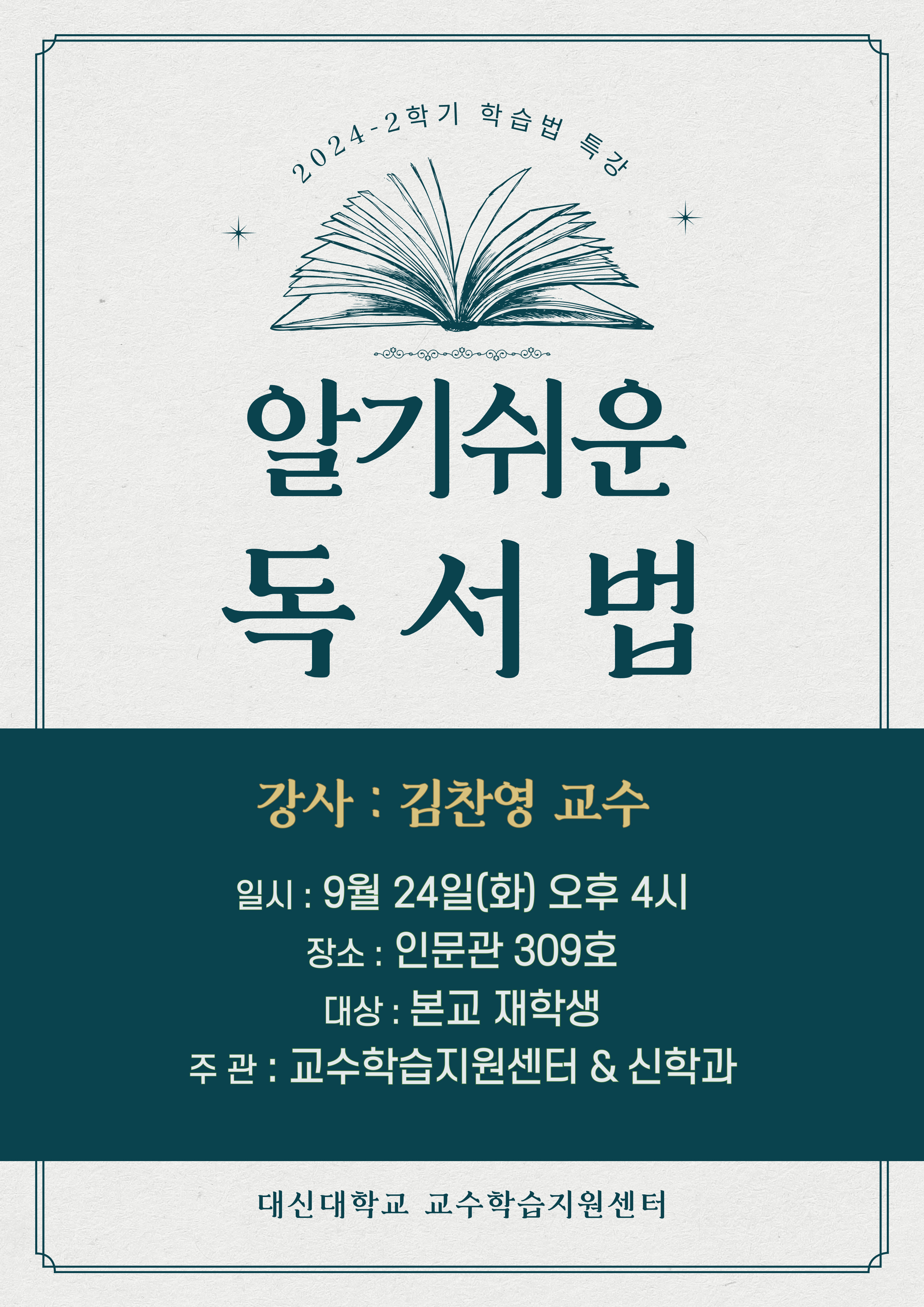 가. 주 제 : 알기 쉬운 독서법 가. 교육 일시 : 2024년 9월 24일(화) 오후 4시 나. 교육 장소 : 인문관 309호 다. 교육 대상 : 본교 재학생 라. 교육 강사 : 김찬영 교수 마. 주 관 : 교수학습지원센터 & 신학과