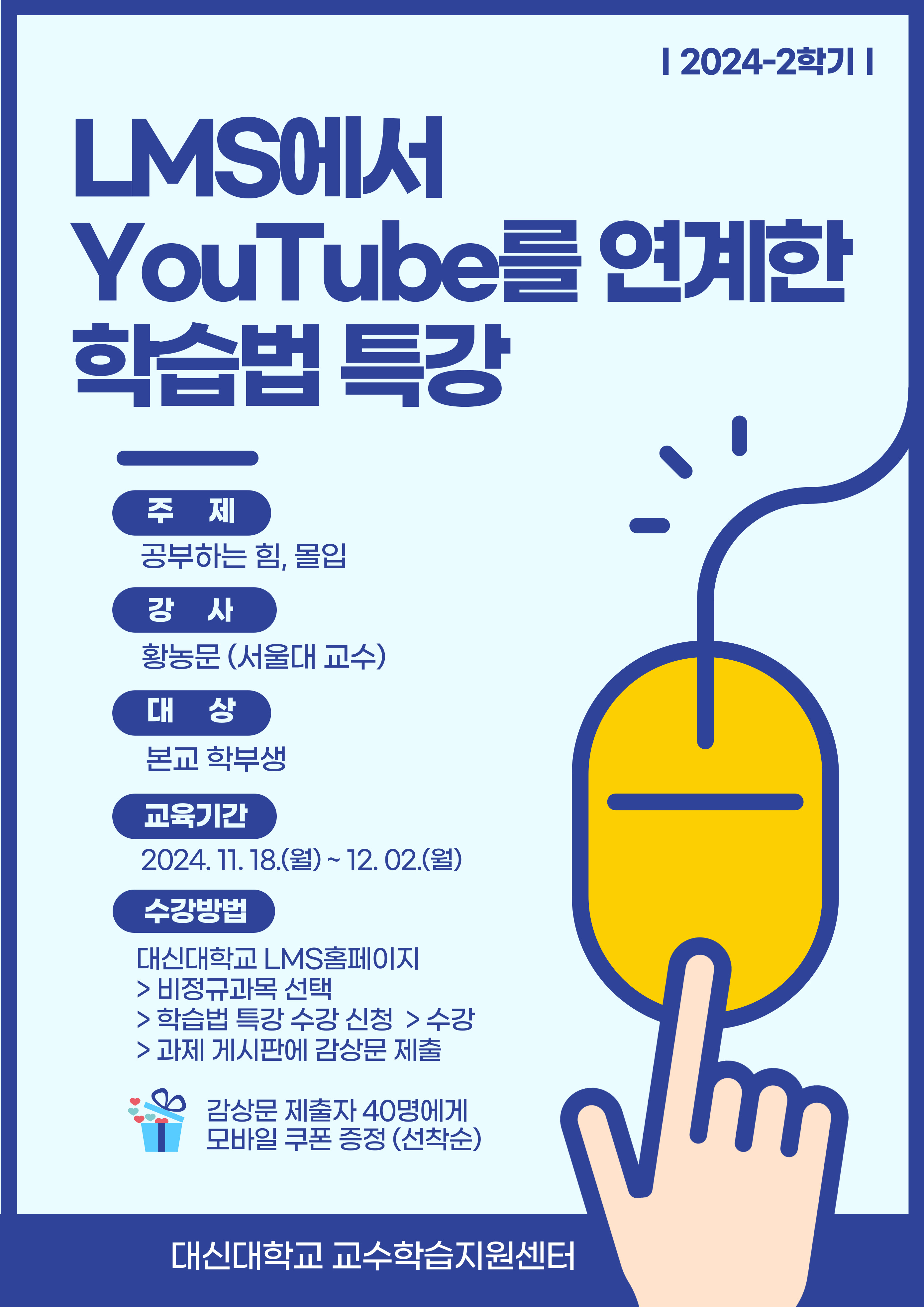 주제 : 공부하는 힘, 몰입 강사 : 황농문(서울대교수) 대상 : 본교 학부생 교육기간 : 2024.11.18(월) ~ 12.02(월) - 2주간 수강방법 : 대신대학교 LMS홈페이지 > 비정규과목 선택 > 학습법 특강 수강 신청 > 수강 > 과제 게시판에 감상문 제출 * 감상문 제출자 40명에게 모바일 쿠폰 증정 (선착순)