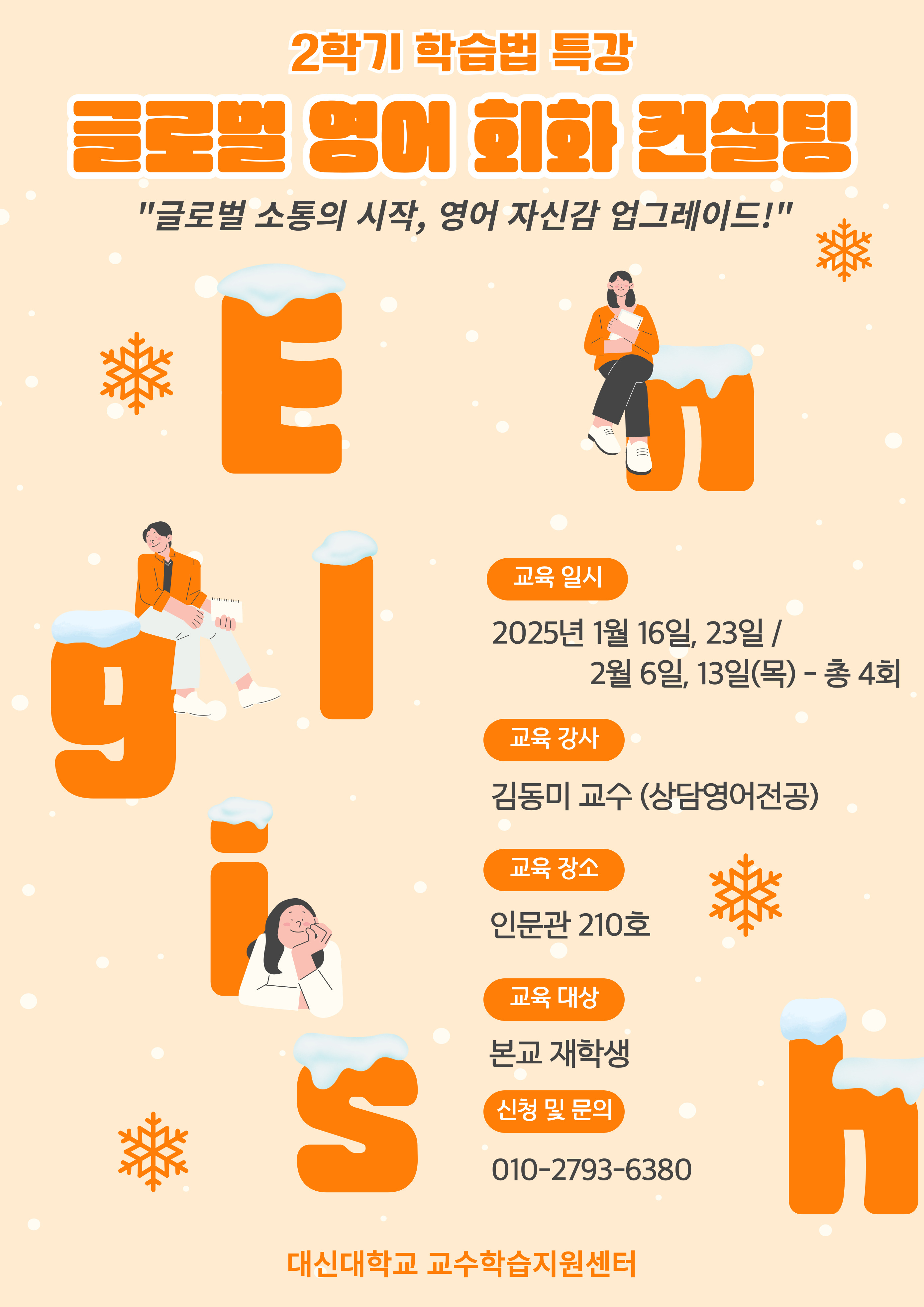 <글로벌 영어회화 컨설팅 안내> 교육 강사 : 김동미 교수 (상담영어전공) 교육 일시 : 2025년 1월 16일, 23일 / 2월 6일, 13일(목) 4회 교육 장소 : 인문관 210호 교육 대상 : 본교 재학생 신청 및 문의 : 010-2793-6380 (김동미 교수)