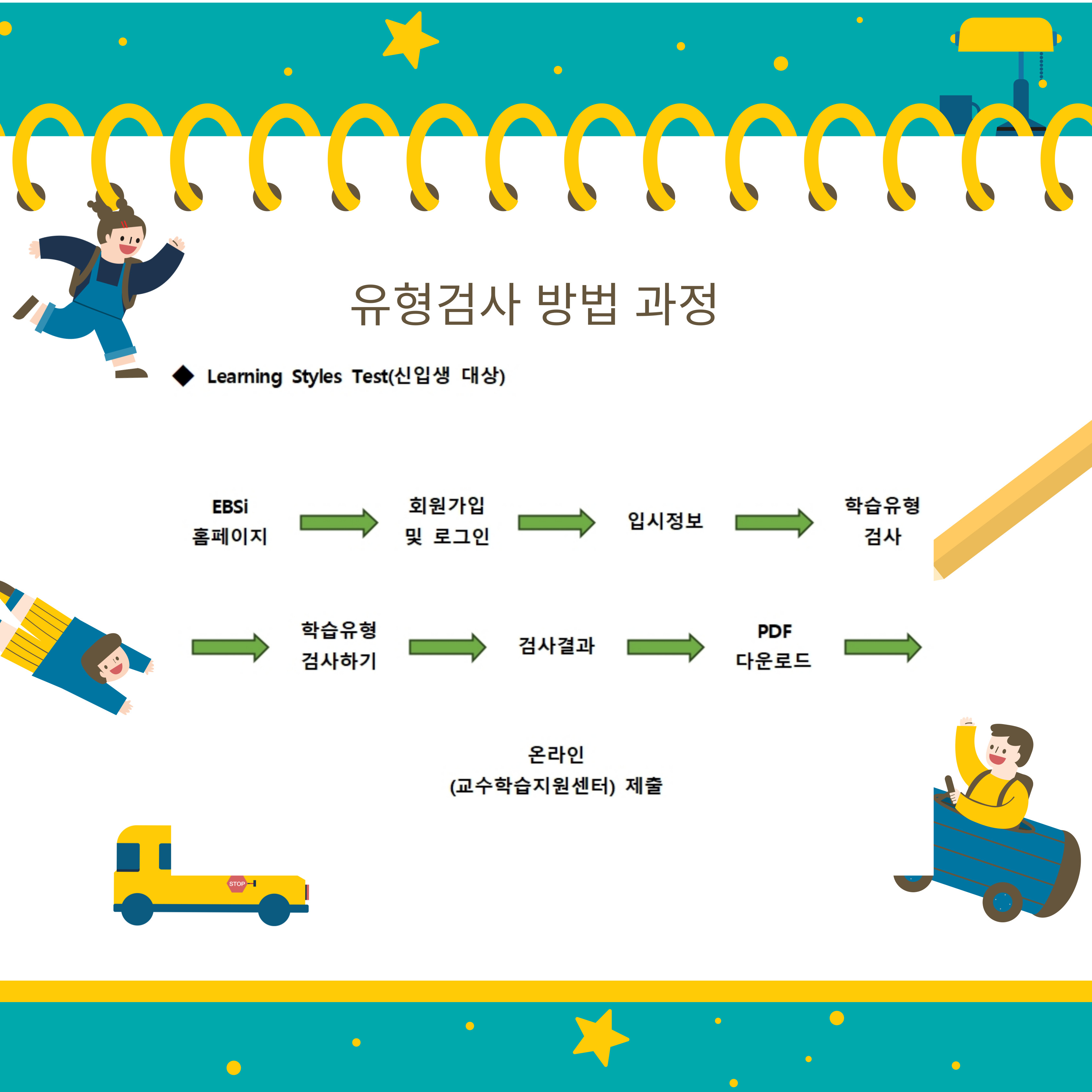 1. 메일로 검사 결과 PDF 파일을 보낸다. --> tlrtlrgkrp78@gmail.com 2. 검사 결과 PDF를 인쇄하여 인문관 1층 왼쪽편 교수학습지원센터로 제출한다. ▼ ▼ ▼ ▼ ▼ ▼ ▼ ▼ ▼ ▼ https://www.ebsi.co.kr/ebs/xip/learnStyle/learnStyleHome.ebs