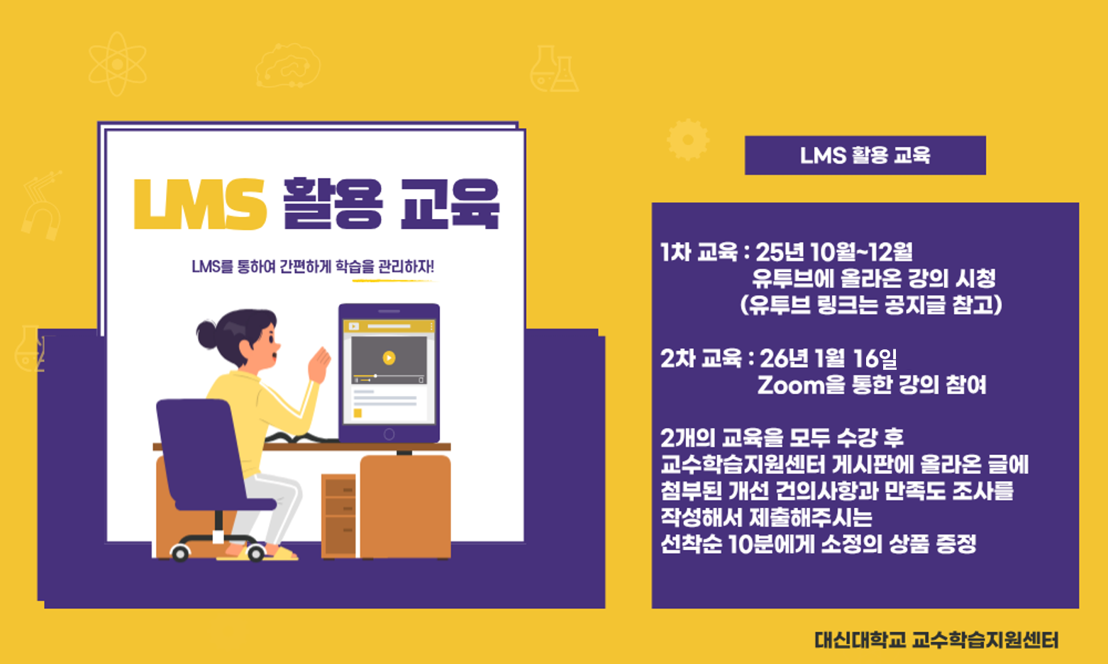 1차 : 2025년 10월 ~ 12월 (유투브를 통한 LMS 교육, 자율 수강) 2차 : 1월 16일 (금) 오전 10:00-11:00 (학습관리시스템 LMS 사용자 교육, ZOOM 활용) https://us06web.zoom.us/j/86930940894?pwd=1i9UUmmUuRVhxAGuuoRLVJf9ixO8vk.1
