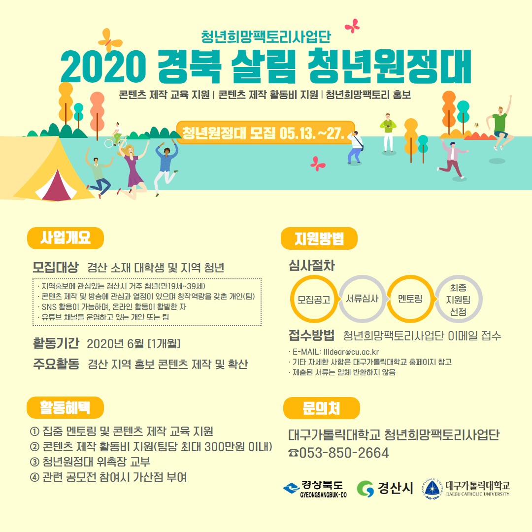 대구가톨릭대학교 청년희망팩토리사업단은 경산시의 지역 특화형 문화자원 등을 소개하는 창의적 콘텐츠를 발굴 · 지원하는 「2020 경북 살림 청년원정대」를 모집하고자 합니다. 지역내 많은 학생 및 청년(예비)창업자들이 참여할 수 있도록 기관의 많은 홍보 협조를 부탁드립니다. ?