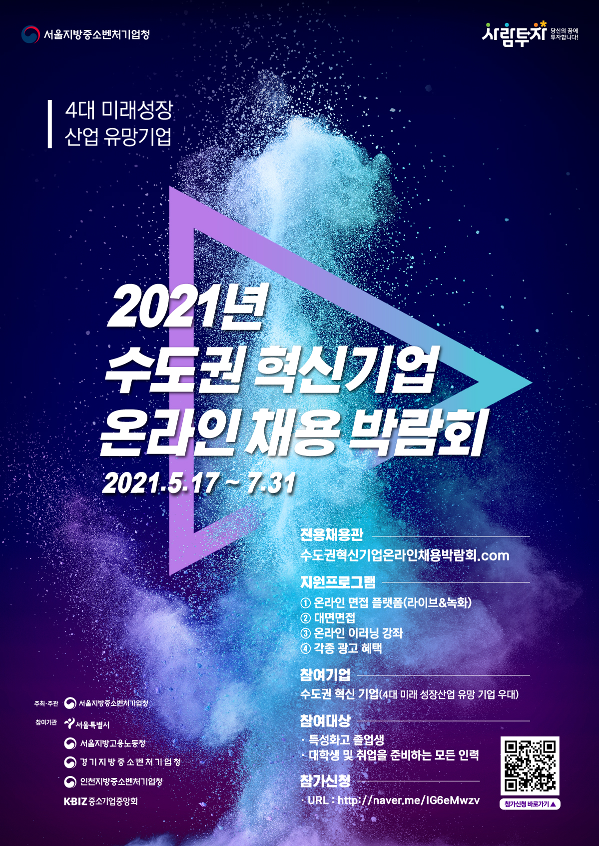 청년 구직작 취업을 위하여 <2021 수도권 혁신기업 온라인 채용박람회>를 다음과 같이 개최합니다. 가, 행사명 : 2021 수도권 혁신기업 온라인 채용박람회 나. 사업기간 : 2021. 5. 17(월)~7. 31(토) * 하반기 개최기간 09.01(수)~11. 30(화) 다. 사이트 : 서울지방중소벤처기업청 전용채용관 1) 주소 : http://수도권혁신기업온랑니채용박람회.com 라. 참여기업 : 수도권 혁신기업(4대 미래성장산업 유망기업, 인재육성형기업, 글로벌 강소기업, 수출유망기업, 소부장기업, 스타트업 등) * 재학생 및 졸업생들이 채용박람회를 활용하여 구직 활동을 할 수 있기를 바랍니다. *채용 박람회 포스터는 첨부파일에 있습니다. 참고하세요. |