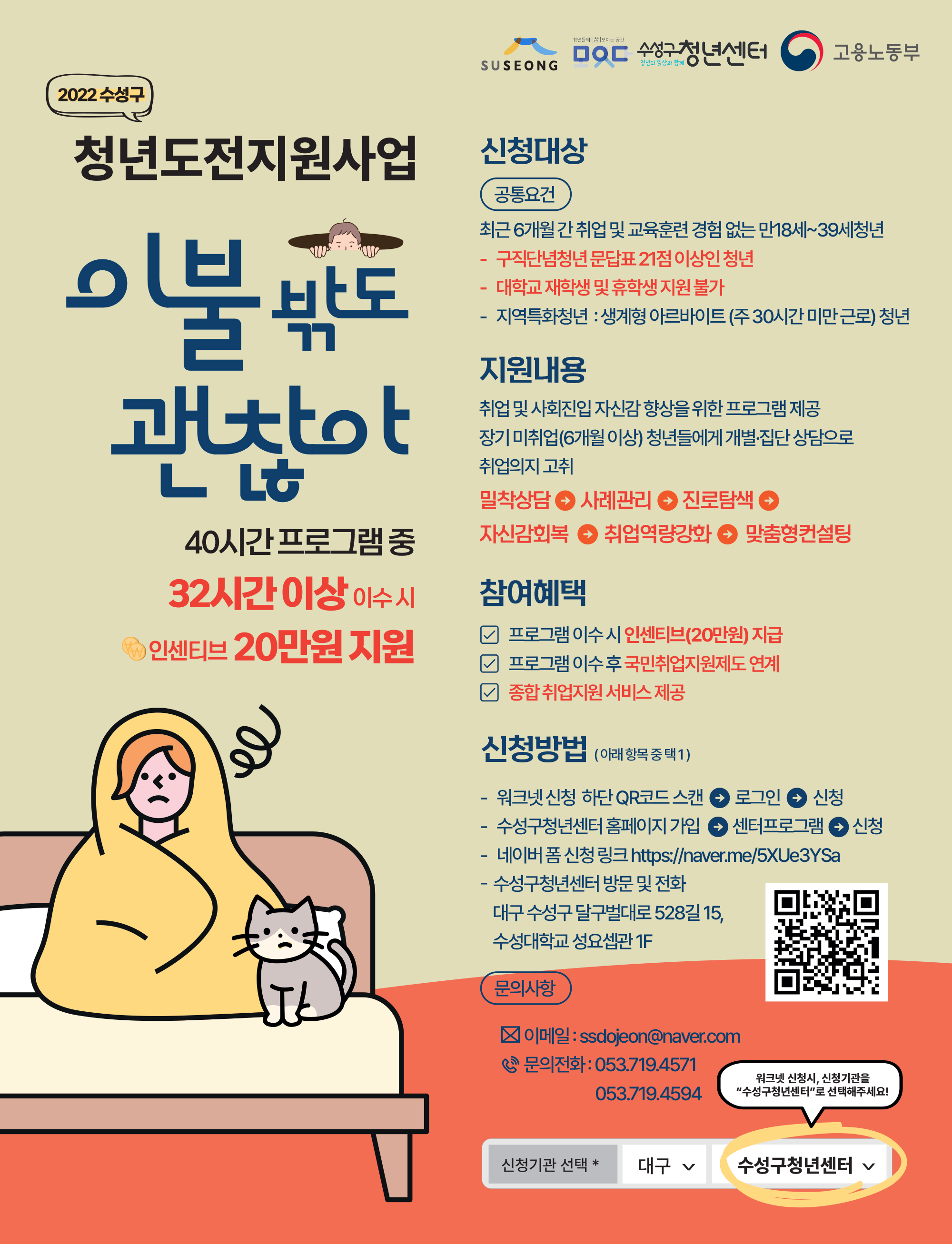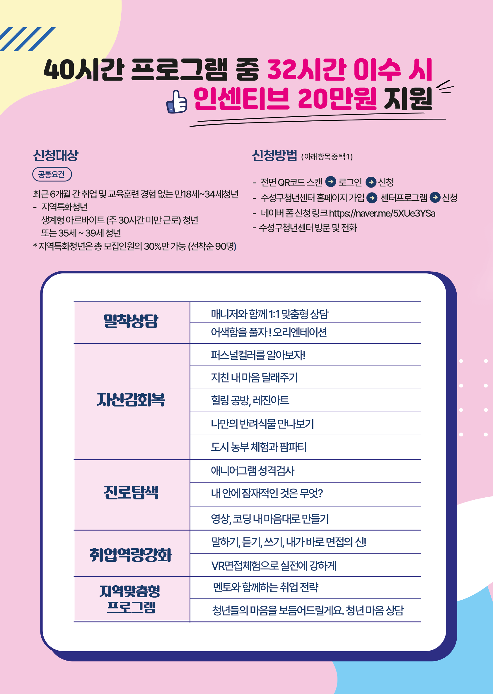 수성구에서는 사회진입이 힘든 구직단념청년 등을 발굴하여 구직의욕을 고취시키고 취업촉진을 지원하고자 <2022년 청년도전 지원사업>을 추진하고 참여자를 모집하고 있습니다. 관심 있는 학생들의 참여 바랍니다. <모집 개요> 모집기간 : 2022년 5월~12월(프로그램 운영기간 중 상시모집) 모집인원 : 300명 모집대상 : 최근 6개월 간 취업 및 교육훈련 경험이 없는 만 18세~39세 청년 등 지원내용 -취업 및 사회진입 자신감 향상을 위한 프로그램 제공 -수료 시 청년에게 인센티브(20만원) 및 고용노동부 국민취업지원제도 연계 지원 신청방법 -수성구청년센터 홈페이지(http://www. suseongyouth. or.kr) -워크넷(work.go.kr) 문의 : 수성구청년센터(tel _053-719-4571), 수성구 청년여성가족과(tel-053-666-2622) 보다 자세한 내용은 아래 첨부파일을 참고하시기 바랍니다. |