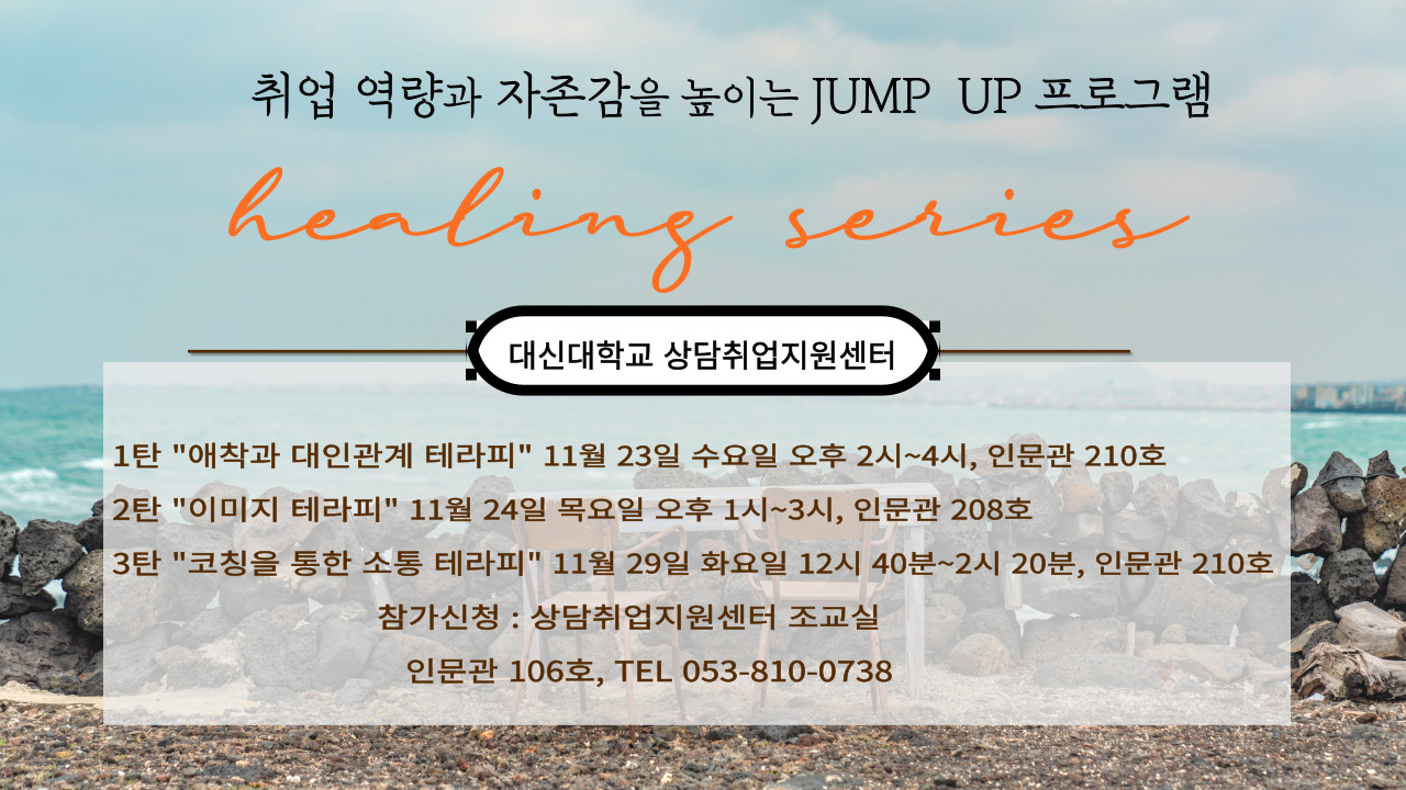 학우 여러분 안녕하세요. 대신대학교 상담취업지원센터에서는 재학생들의 대인관계와 취업을 돕기 위한 프로그램을 진행하고자 합니다. 유능한 강사님들을 모시고 학생들에게 실제적인 도움을 주기 위한 시간으로 마련되었으니 많은 학생들의 적극적인 참여 바랍니다. ※프로그램 참여 신청이나 진행 시 도움이 필요한 학생들(외국민, 새터민, 장애학생, 만학도 등)의 경우 도우미 지원 등 편의를 제공할 예정이니 신청 시 알려주시기 바랍니다. 제목 : 취업 역량과 자존감을 높이는 JUMP UP 프로그램-힐링 시리즈- 참가 신청 : 상담취업지원센터 조교실(인문관 106호), TEL 053 810 0738 날짜 : 2022년 11월 23일 수요일 2시~4시, 인문관 210호 2022년 11월 24일 목요일 1시~3시 인문관 208호 2022년 11월 29일 화요일 12시 40분~2시 20분 인문관 210호