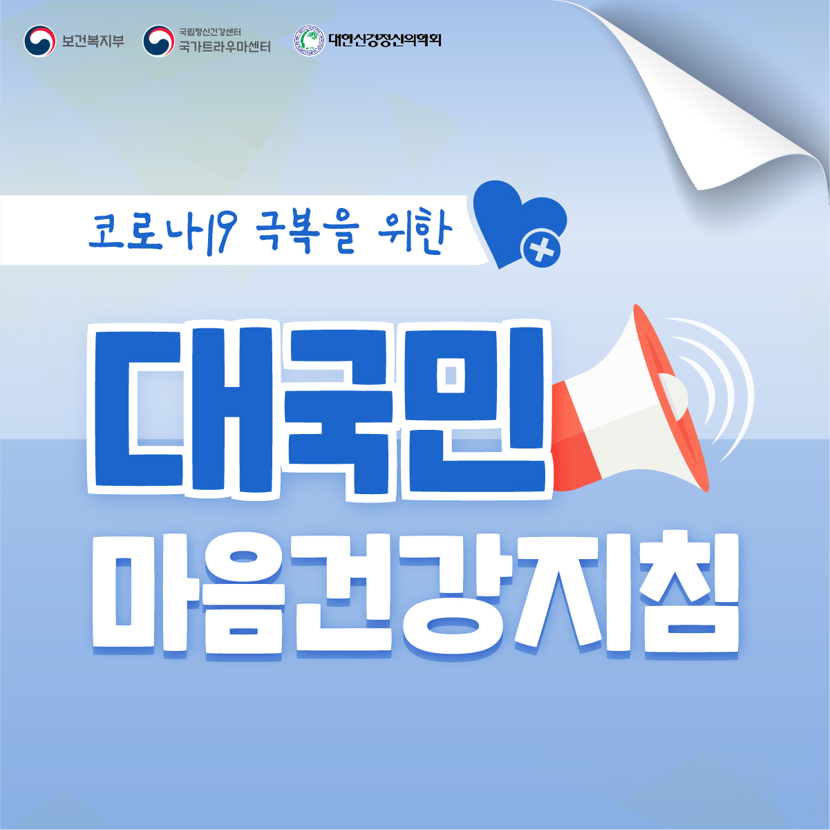 보건복지부·국가트라우마센터·대한신경정신의학회 공동으로 제작한 포스터 및 카드뉴스입니다.코로나19로 인한 마음의 고통, 예방하고 치료할 수 있습니다. 위기상황, 다함께 이겨냅시다.