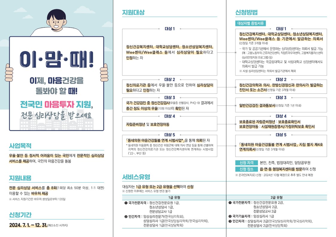 2024년 전국민 마음투자 지원사업이 시작됩니다!! 우울이나 불안 등 정서적 어려움이 있는 누구나 전문적인 심리상담 서비스를 지원받으실 수 있습니다. 자세한 내용은 포스터와 안내문을 참고하셔서 정서적 어려움을 겪는 분들이 많은 혜택을 누릴 수 있도록 안내와 홍보 부탁드려요!