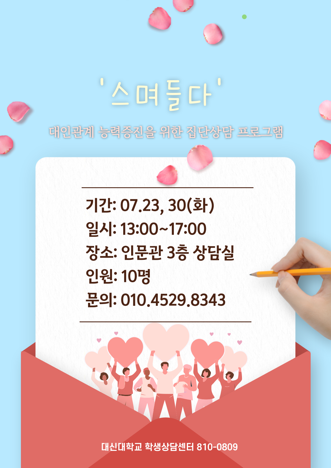 기간: 07. 23, 30(화) 일시: 13:00~17:00 장소: 인문관 3층 상담실 인원: 10명 문의: 010. 4529.8343
