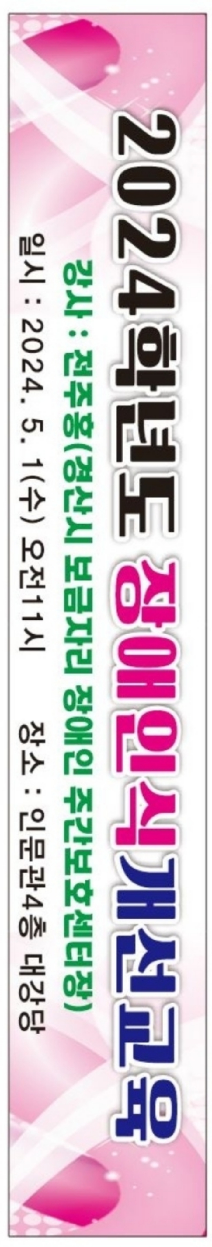 - 2024년 장애인식개선교육안내 - 1. 일시: 2024. 5. 1. (수) 오전 11시 2. 장소: 인문관 4층 대 강당 3. 교육 대상: 전체 대학생(대학원생 포함) 및 교직원 4. 교육 내용 ⓵ 장애란 무엇인가? ⓶ 장애인 현황 및 장애 발생 요인 ⓷ 장애인에 대한 에티켓(장애유형별) ⓸ 다시 생각해 보기(토론과 질문)