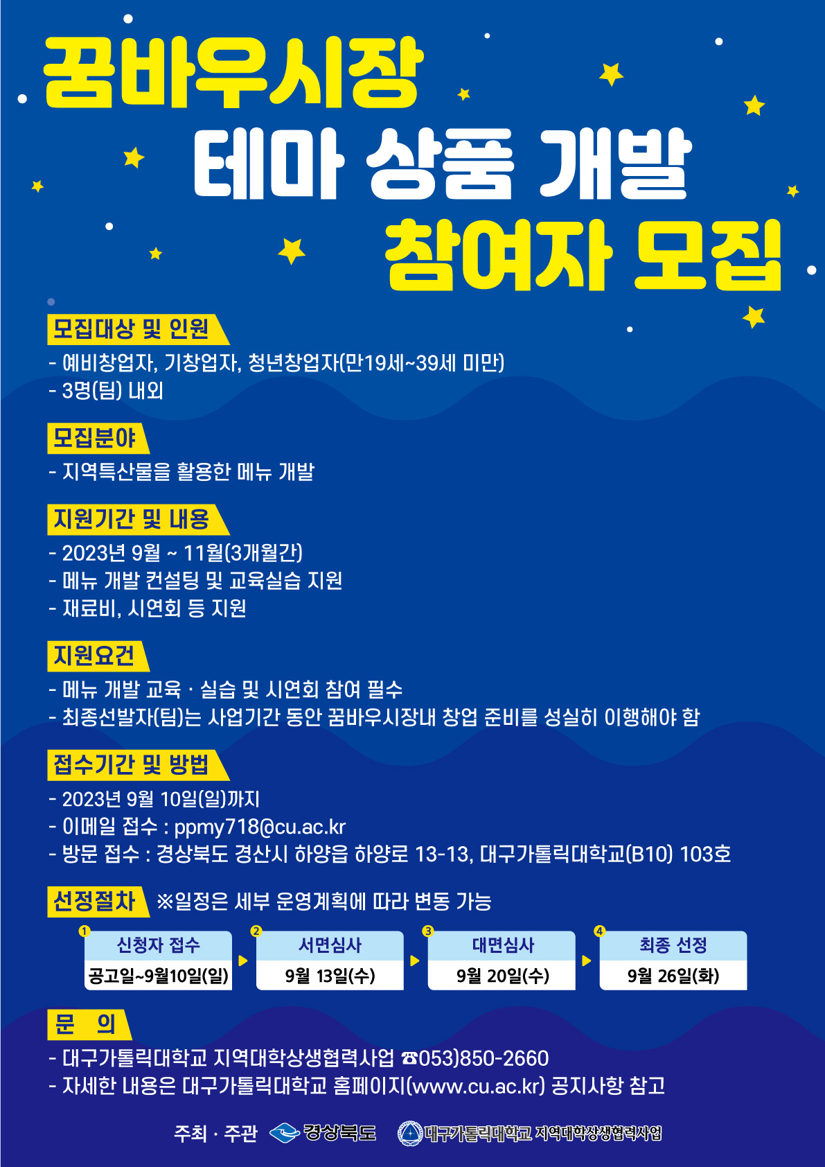 1. 공 고 명 : 꿈바우시장 테마 상품 개발 참여자 모집 2. 모집규모 : 3명(팀) 내외 3. 모집대상 : 예비창업자, 기창업자, 청년창업자 (만 19세 ~ 39세미만) 등 4. 모집기간 : 공고일로부터 2023.09.10까지 5. 주요내용 - 지역특산물을 활용한 메뉴 개발 - 메뉴 개발 컨설팅 및 교육실습 지원 - 재료비, 시연회 등 지원 6. 문 의 처 : 대구가톨릭대학교 지역대학상생협력사업단 (053-850-2660)
