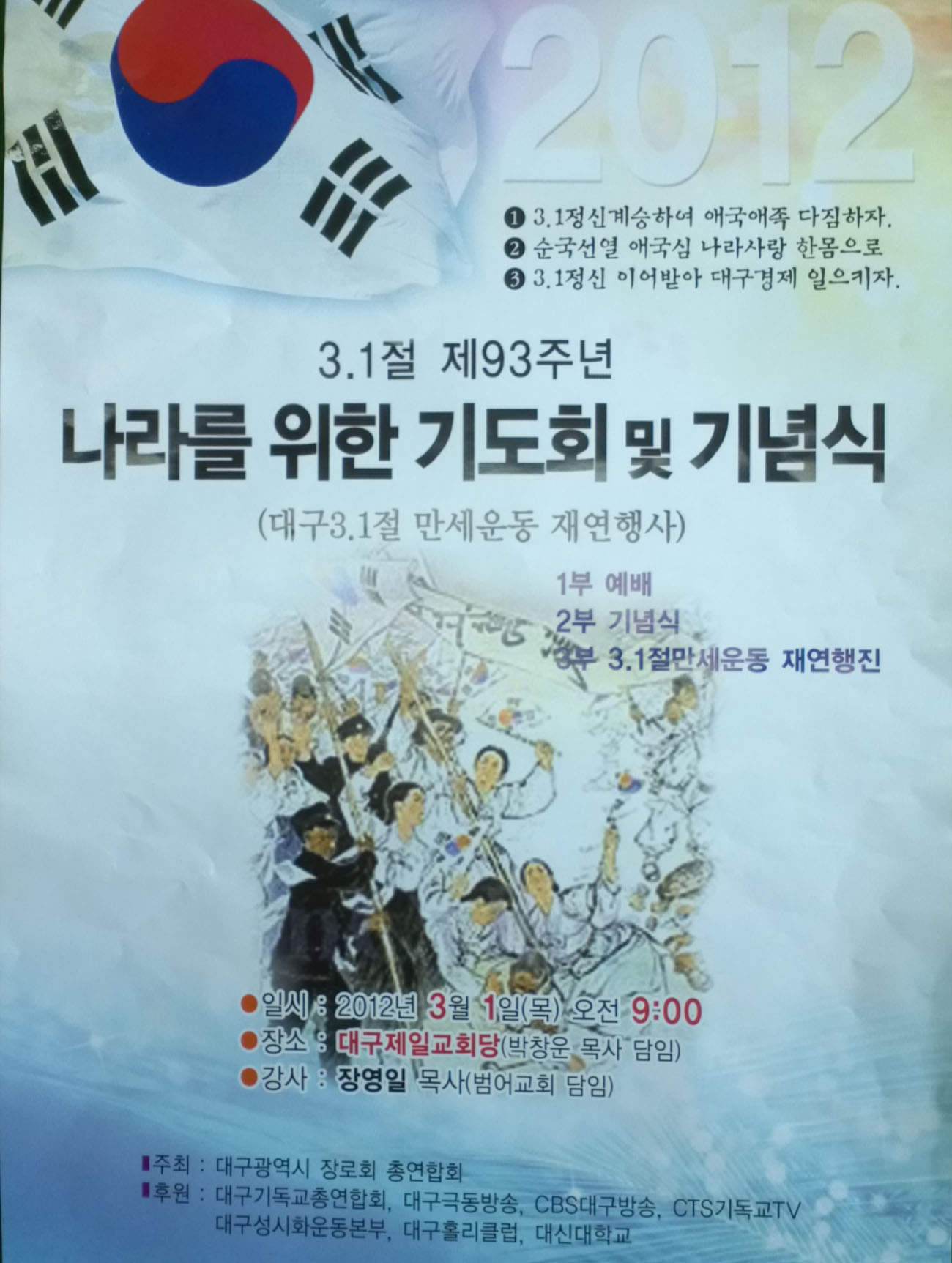 2012년 3월1일(목) 07:00 전재규 총장, 박창식 목사 출연2. CTS 방영 안내 [거룩한함성] 대구 3.1운동 다큐멘터리 3월1일 오후 2시10분~3시 10분- 많은 방영 바랍니다. -3. 3.1절 제93주년 나라를 위한 기도회 및 기념식 안내.