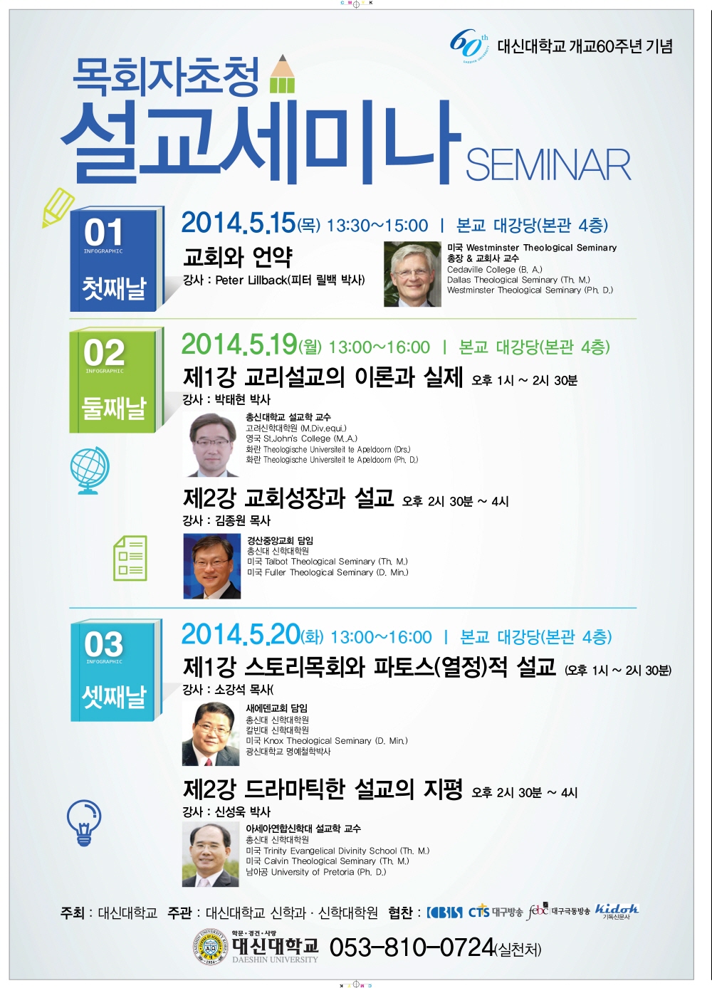 대신대개교 60주년 기념 행사로 신학과 및 신대원에서 "목회자 초청 설교세미나"를 첨부 파일(포스터)과 같이 개최합니다. 학부및 신대원 학생들의 적극적인 참여를 부탁드리며, 지역교회 목회자들께서 참여하셔서 목회에 도움이 되는 자료를 공유하시기 바랍니다 |