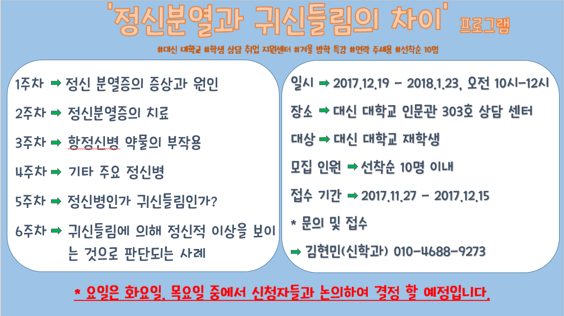 (상담,취업지원센터) '정신분열과 귀신들림의 차이' 강의 프로그램 공지