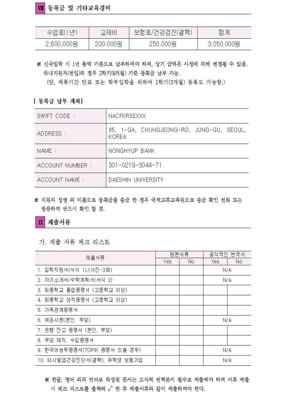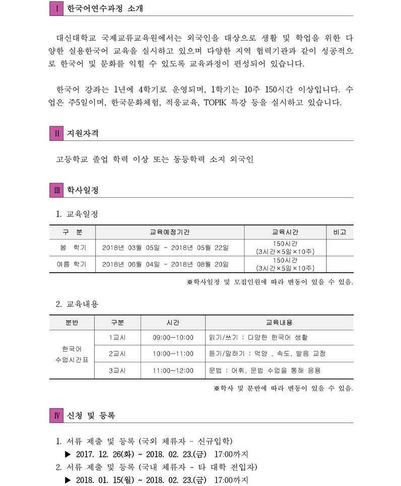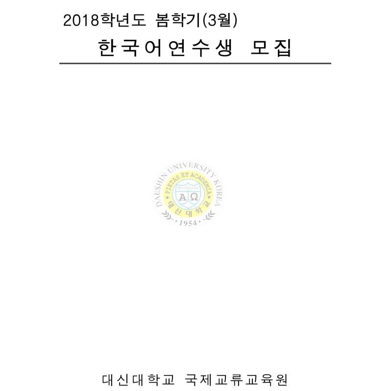 ATTACH : 1. 2018학년도 봄학기(3월) 한국어 연수생 모집요강 2. 2018 SPRING SEMESTER (MARCH) APPLICATION GUIDELINE 3. 2018 SPRING SEMESTER (MARCH) APPLICATION FORM |