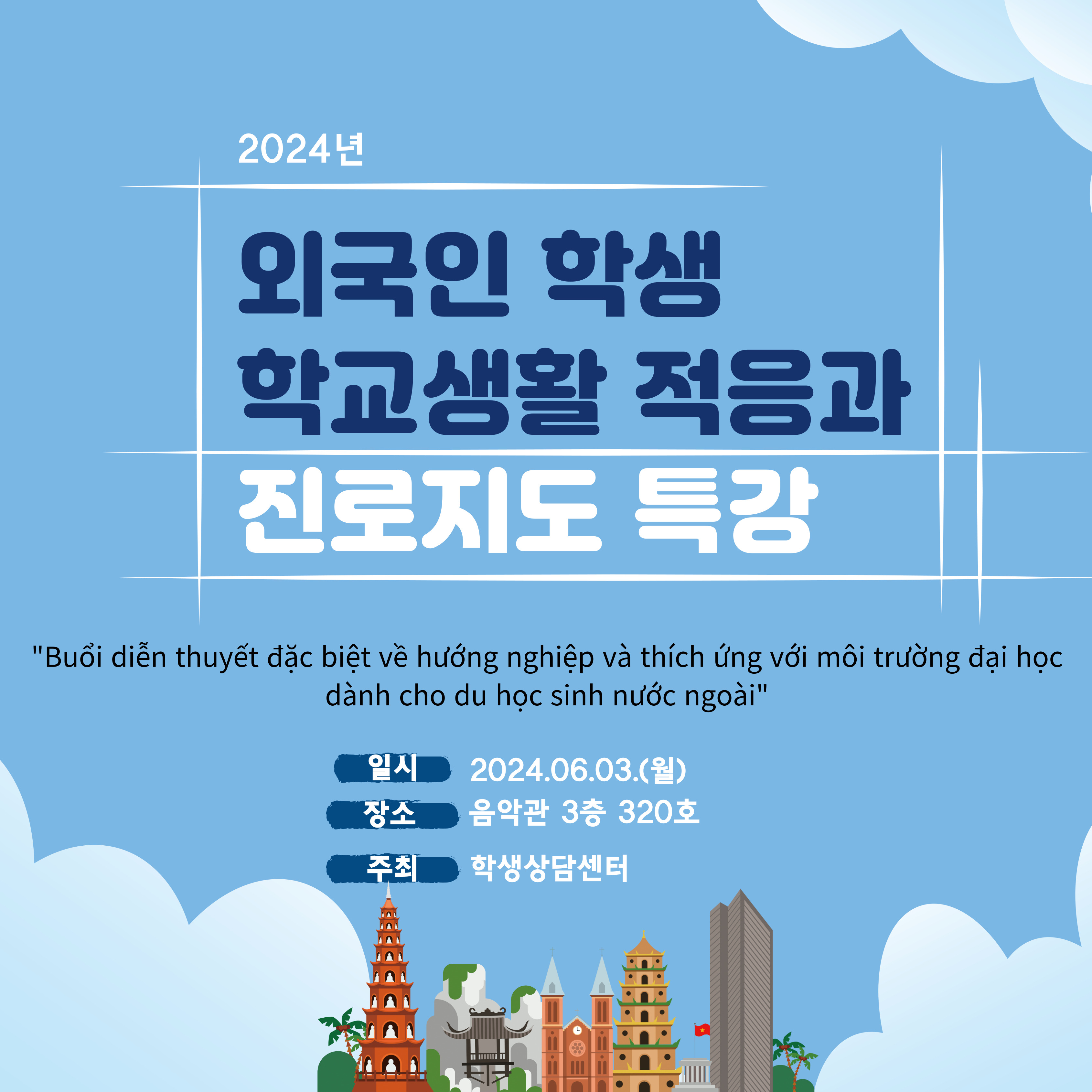 일시: 2024. 06. 03 (월) 오전 10시~11시 장소: 음악관 3층 320호 강사: 김경식 교수 (호산대학교 특수직업재활과 학과장, YN심리상담연구소장 * 외국인 재학생들의 많은 관심과 참여 바랍니다. |