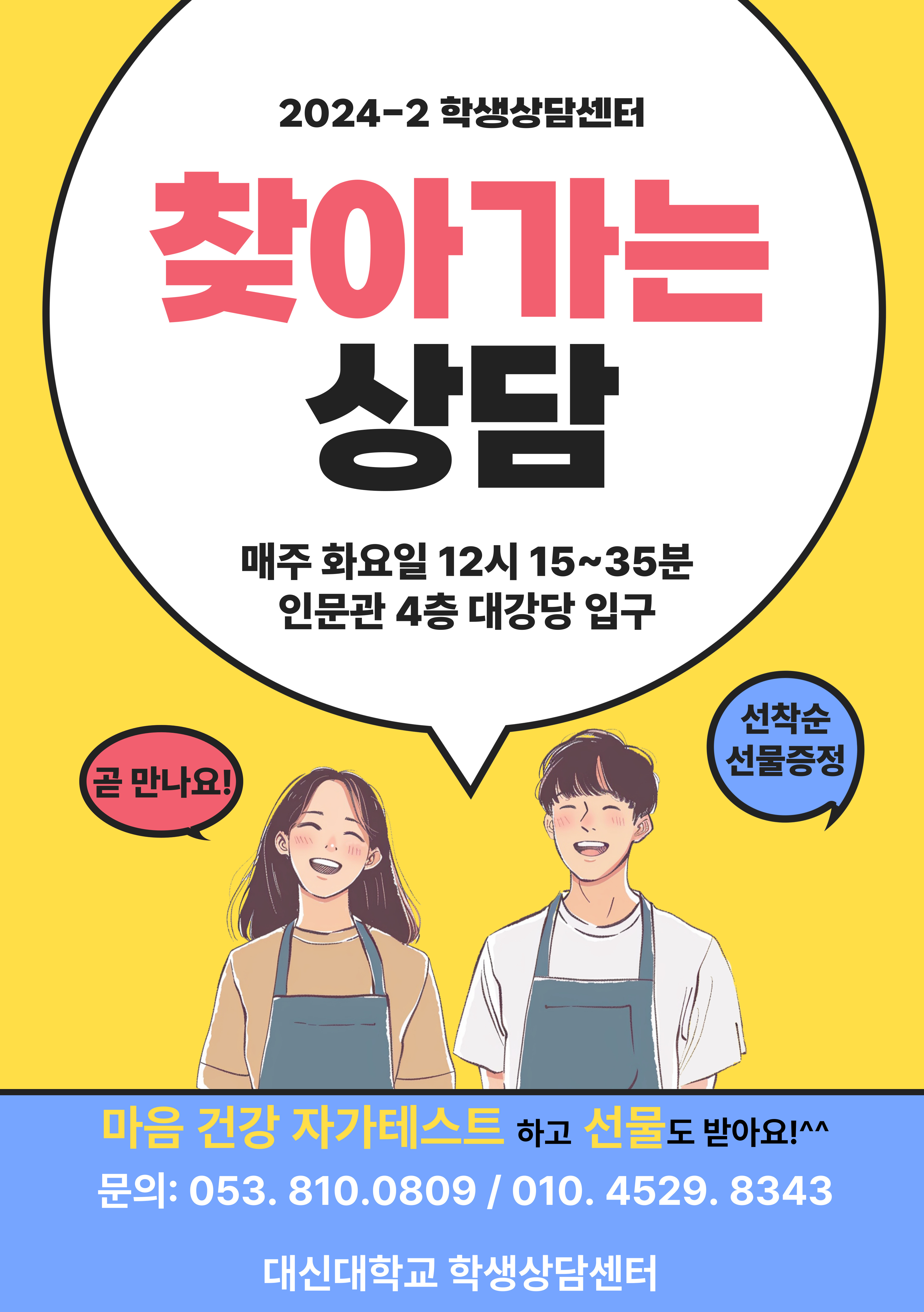 내용: 마음건강 자가테스트( 우울,불안, 스트레스, 게임중독, 자기효능감 등) 대상: 대신대학교 재학생 누구나! * 마음건강 자가테스트하고 선물도 받아요!! * 많은 관심과 애용부탁드려요^^ ![]() |