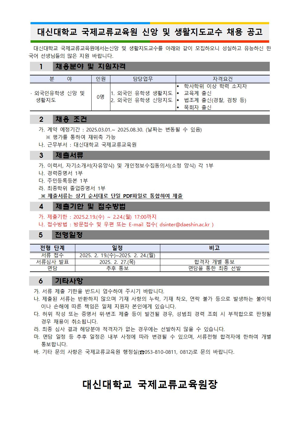 대신대학교 국제교류교육원 신앙 및 생활지도교수 채용 공고