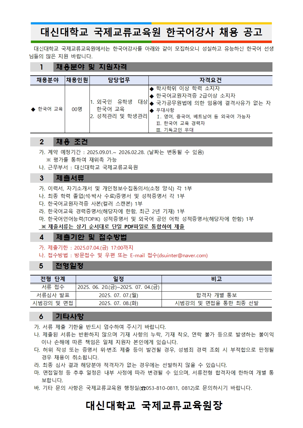 대신대학교 국제교류교육원 한국어강사 채용 공고