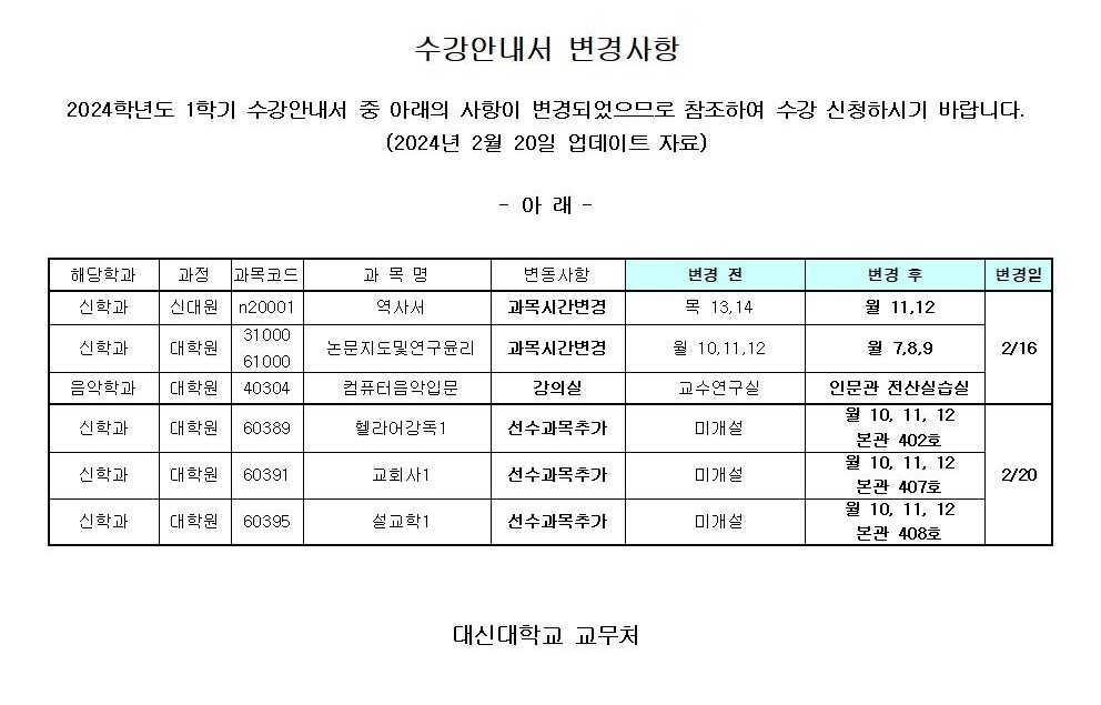 2024학년도 1학기 수강안내서 변경사항 안내(2/20)