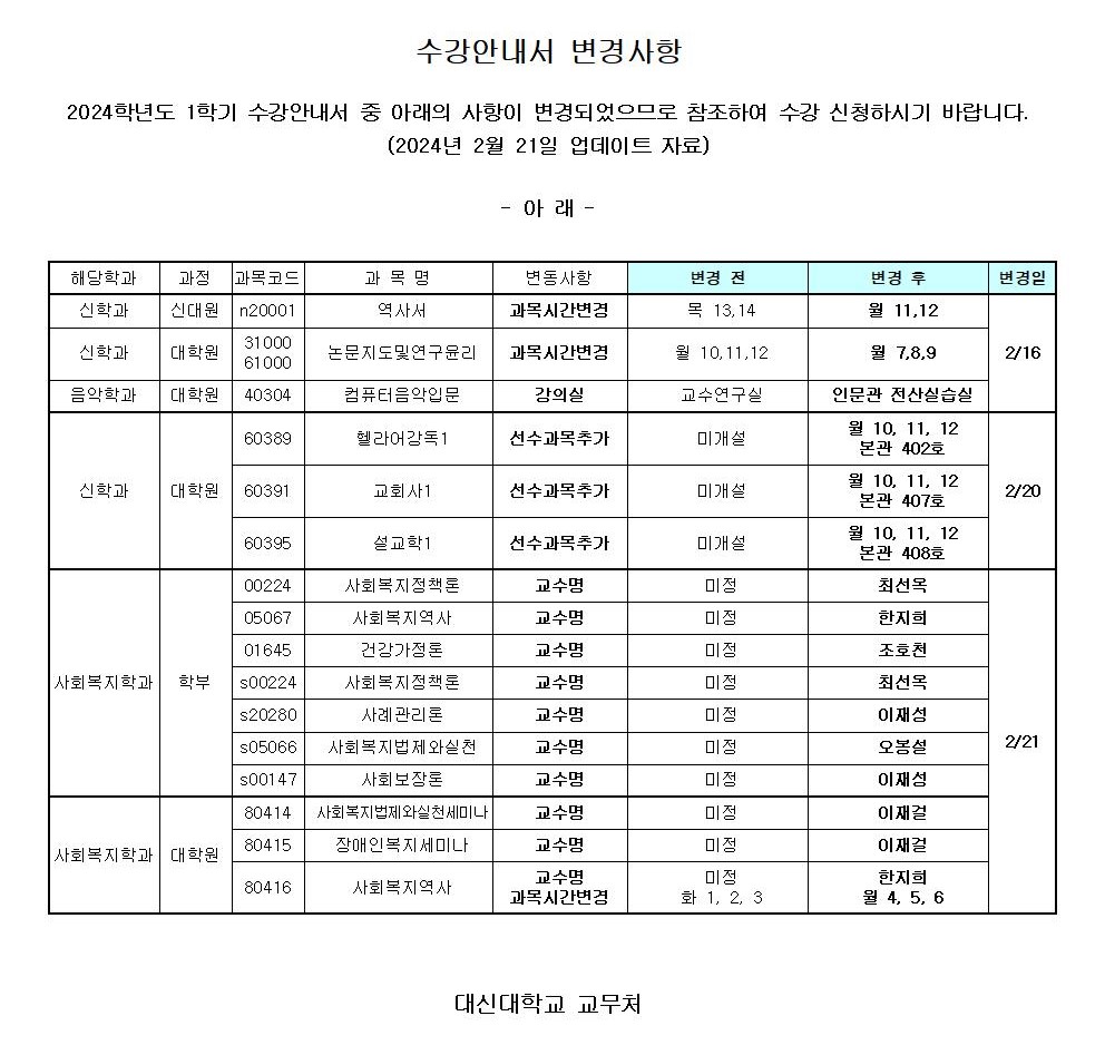 2024학년도 1학기 수강안내서 변경사항 안내(2/21)