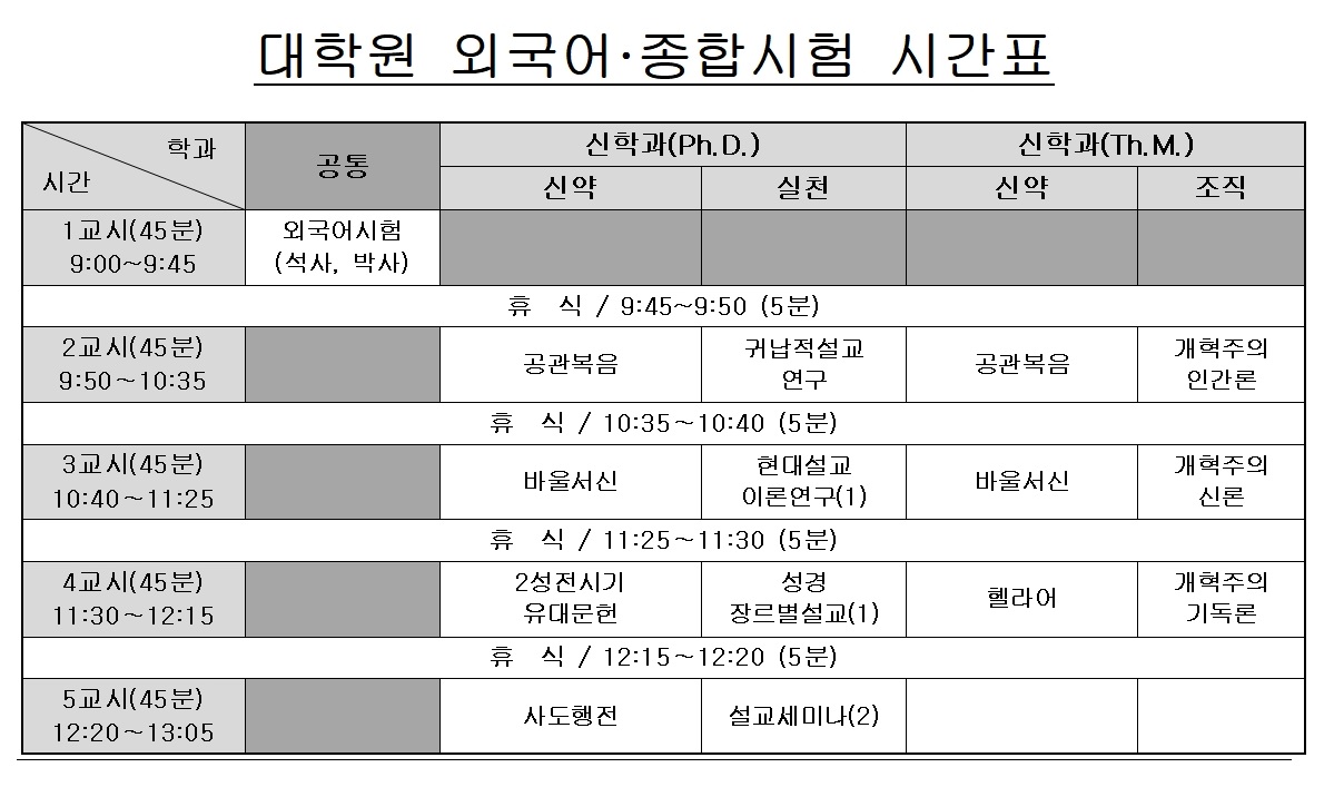 ■ 외국어시험 1. 일시 : 2024년 4월 26일(금) 9:00 ~ 9:45 (석·박사과정) 2. 장소 : 본관 409호 ■ 종합시험 1. 일시 : 2024년 4월 26일(금) 9:50 ~ 13:05 (박사과정) 9:50 ~ 12:15 (석사과정) 2. 장소 : 본관 409호