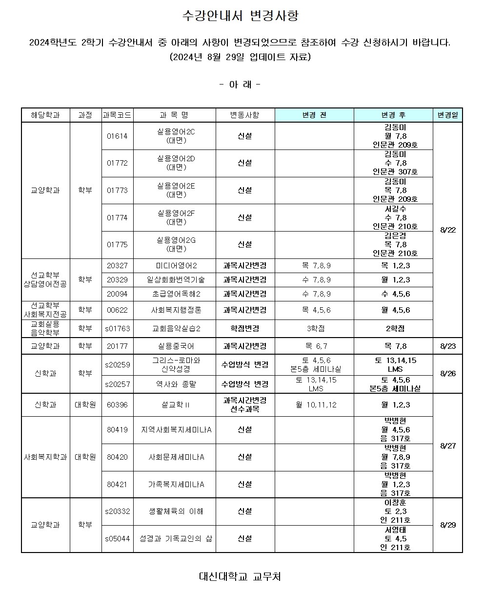 2024학년도 2학기 수강안내서 변경사항 안내(8/29)