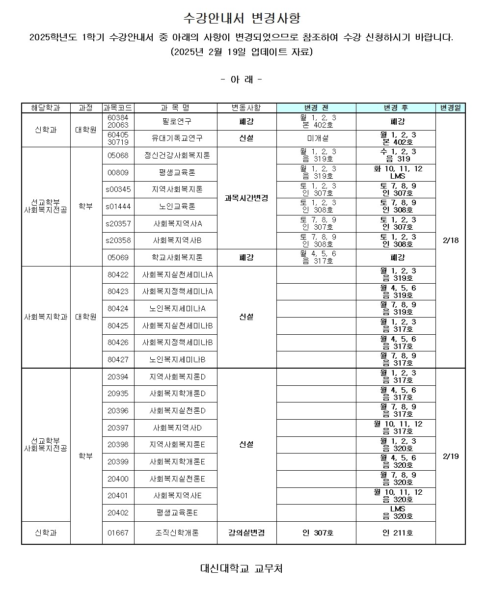 2025학년도 1학기 수강안내서 변경사항 안내(2/19)